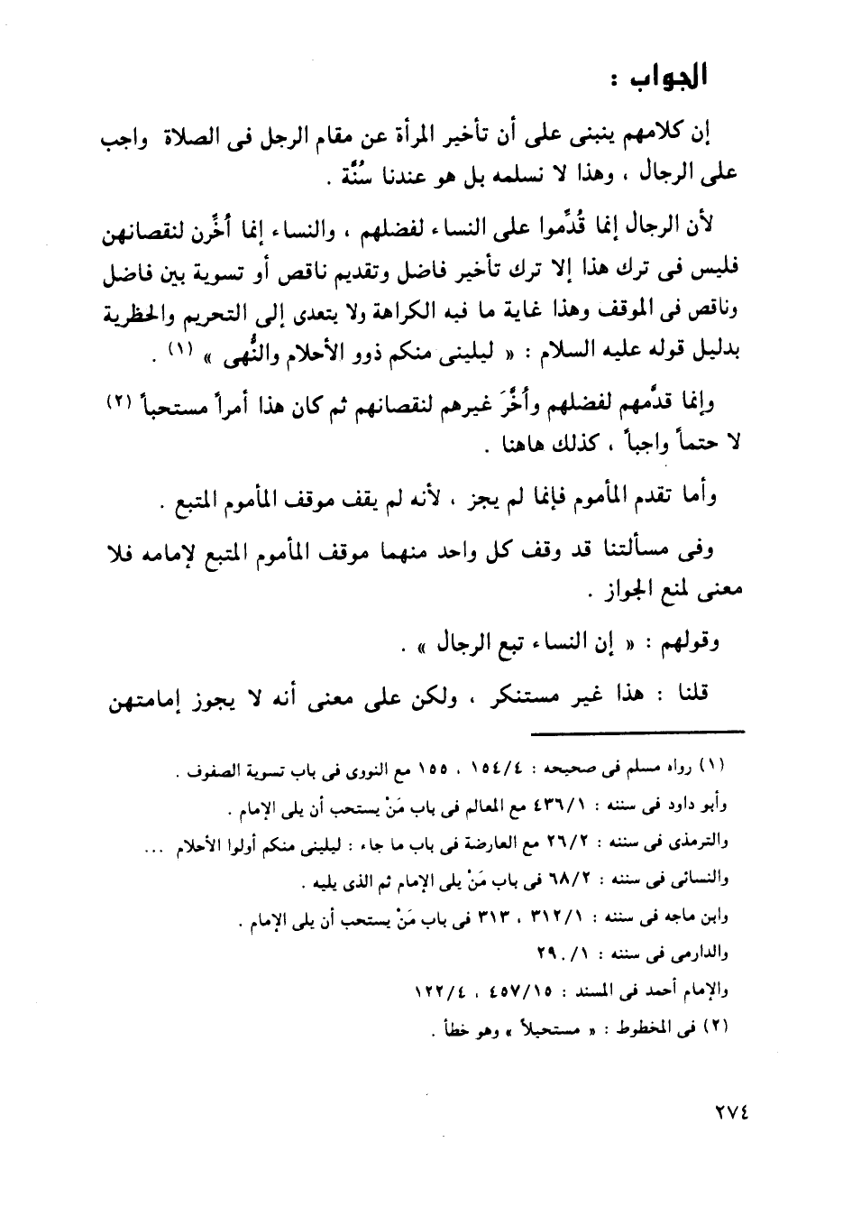 إن كلامهم ينبني على أن تأخير المرأة عن مقام الرجل في الصلاة واجب على الرجال، وهذا لا نسلمه بل هو عندنا سنة.