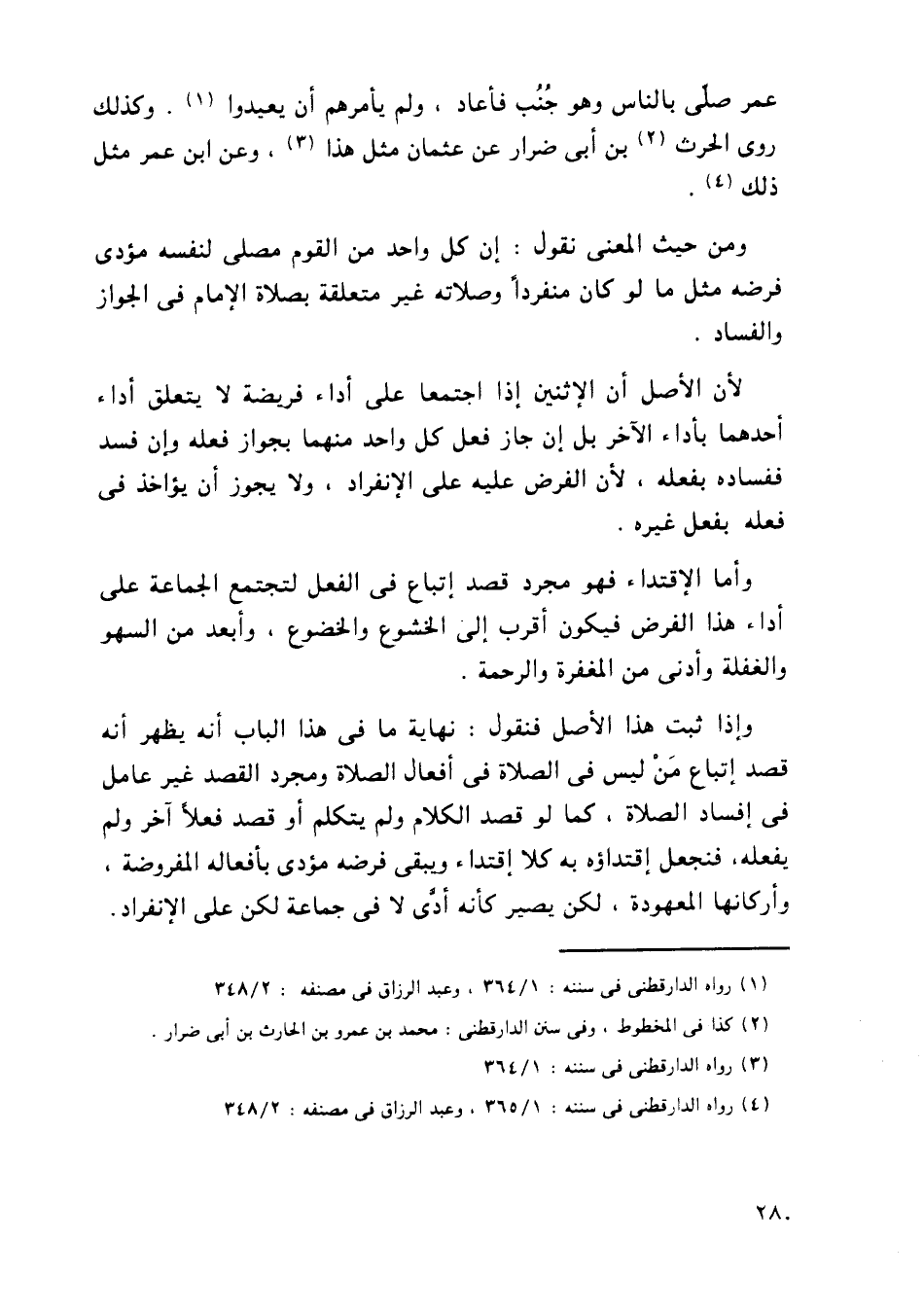 عمر صلى بالناس وهو جنب فأعاد، ولم يأمره أن يعيدوا. وكذلك روى الحرث بن أبي ضرار عن عثمان مثل هذا، وعن ابن عمر مثل ذلك.