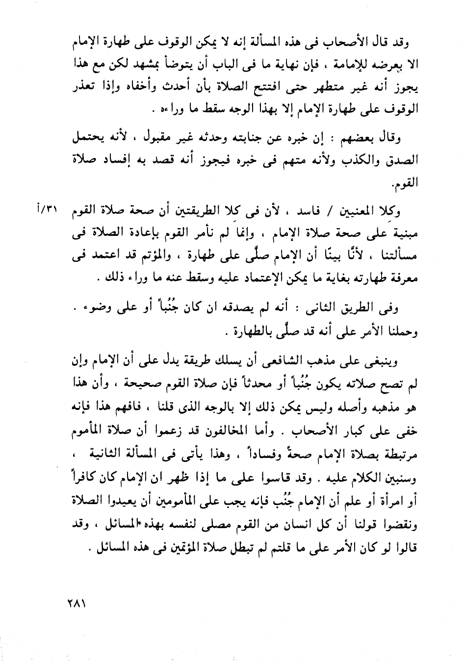 وينبغي على مذهب الشافعي أن يسلك طريقة يدل على أن الإمام وإن لم تصح صلاته يكون جنباً أو محدثاً فإن صلاة القوم صحيحة، وأن هذا هو مذهبه وأصله وليس يمكن ذلك إلا بالوجه الذي قلنا، فافهم هذا فإنه خفي على كبار الأصحاب. وأما المخالفون قد زعموا أن صلاة المأموم مرتبطة بصلاة الإمام صحة وفساداً، وهذا يأتي في المسألة الثانية، وسنبين الكلام عليه. وقد قاسوا على ما إذا ظهر أن الإمام كان كافراً أو امرأة أو علم أن الإمام جنب فإنه يجب على المأمومين أن يعيدوا الصلاة ونقضوا قولنا أن كل إنسان من القوم مصلى لنفسه بهذه المسائل، وقد قالوا لو كان الأمر على ما قلتم لم تبطل المؤتمين في هذه المسائل.