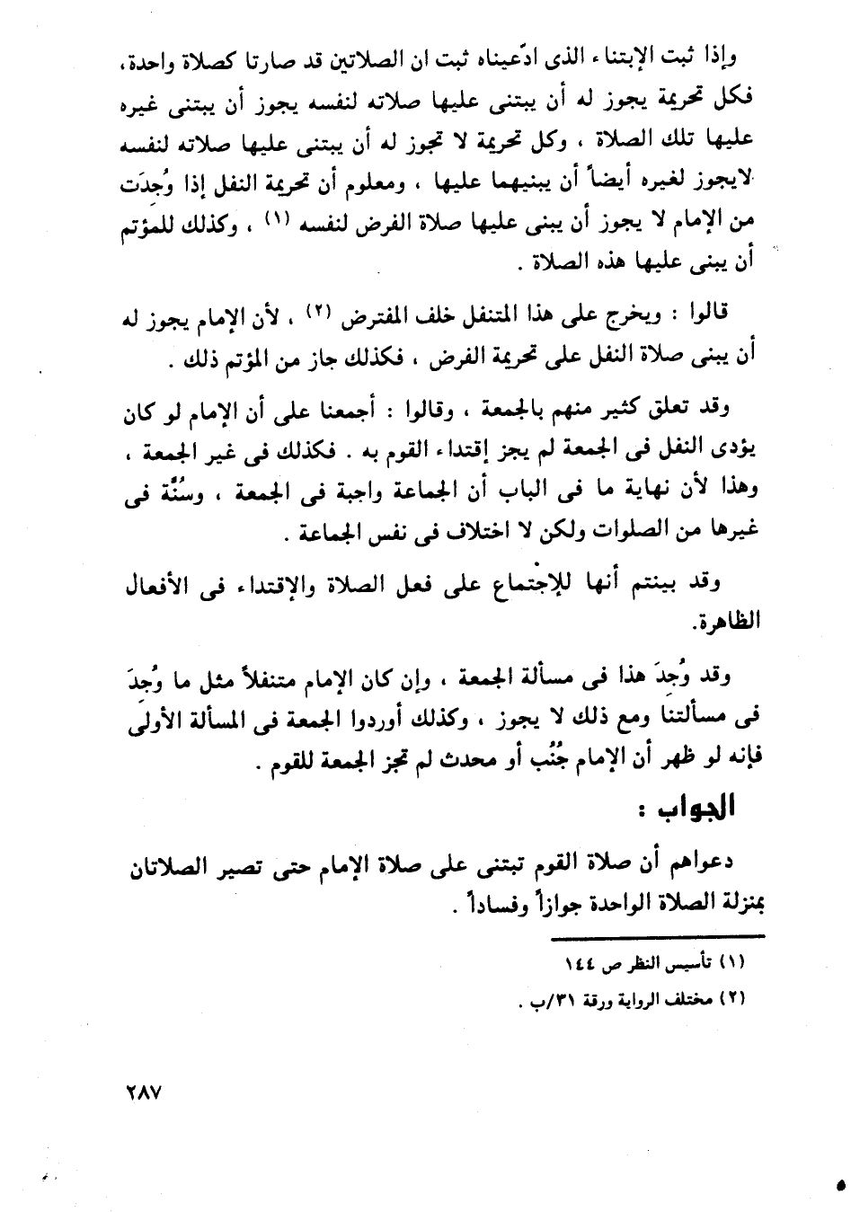 وإذا ثبت الإبتناء الذي ادعيناه ثبت أن الصلاتين قد صارتا كصلاة واحدة، فكل تحريمه يجوز له أن يبتنى عليها صلاته لنفسه يجوز أن يبتنى غيره عليها تلك الصلاة، وكل تحريمه لا تجوز له أن يبتنى عليها صلاته لنفسه لا يجوز لغيره أيضاً أن يبنيهما عليها، ومعلوم أن تحريمة النفل إذا وجدت من الإمام لا يجوز أن يبني عليها صلاة الفرض لنفسه، وكذلك المؤتم أن يبني عليها هذه الصلاة.