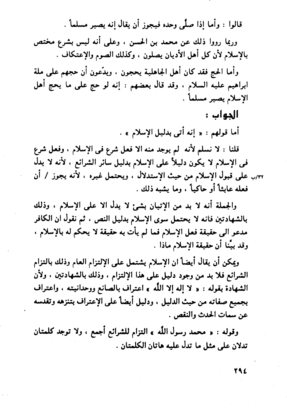 والجملة أنه لابد من الإتيان بشيء لا يدل إلا على الإسلام، وذلك بالشهادتين فإنه لا يحتمل سوى الإسلام بدليل النص، ثم نقول أن الكافر مدعو إلى حقيقة فعل الإسلام فما لم يأت به حقيقة لا يحكم له بالإسلام، وقد بينا أن حقيقة الإسلام ماذا.