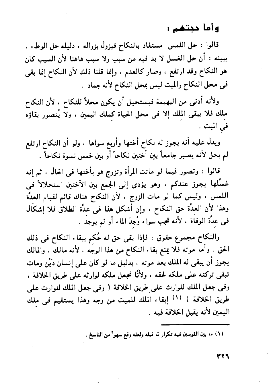 والنكاح مجموع حقوق: فإذا بقى حق له حكم ببقاء النكاح في ذلك الحق. وأما موته فلا يمنع بقاء النكاح من هذا الوجه، لأنه مالك، والمالك يجوز أن يبقى له الملك بعد موته، بدليل ما لو كان على إنسان دين ومات تبقى تركته على ملكه لحقه، ولأنا نجعل ملكه لوارثه على طريق الخلافة، وفي جعل الملك للوارث على طريق الخلافة (وفي جعل الملك للوارث على طريق الخلافة) إبقاء الملك للميت من وجه وهذا يستقيم في ملك اليمين لأنه يقبل الخلافة فيه.