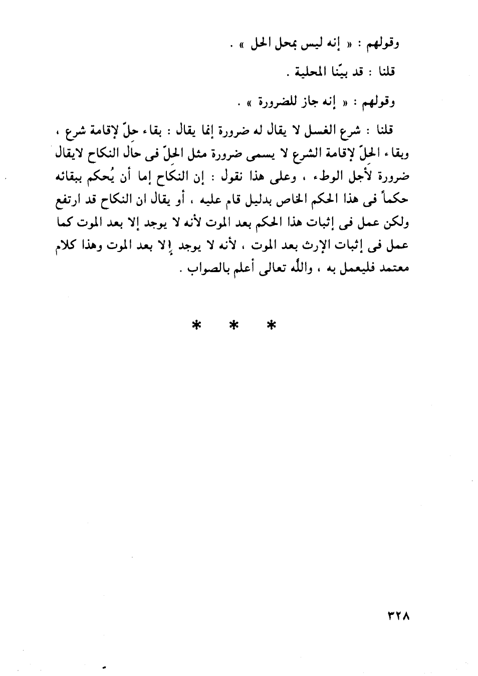 قلنا: شرع الغسل لا يقال له ضرورة إنما يقال: بقاء حل لإقامة شرع، وبقاء الحل لإقامة الشرع لا يسمى ضرورة مثل الحل في حال النكاح لا يقال ضرورة لأجل الوطء، وعلى هذا نقول: إن النكاح إما أن يحكم ببقائه حكماً في هذا الحكم الخاص بدليل قام عليه، أو يقال أن النكاح قد ارتفع ولكن عمل في إثبات هذا الحكم بعد الموت لأنه لا يوجد إلا بعد الموت كما عمل في إثبات الإرث بعد الموت، لأنه لا يوجد إلا بعد الموت وهذا كلام معتمد فليعمل به، والله تعالى أعلم بالصواب.