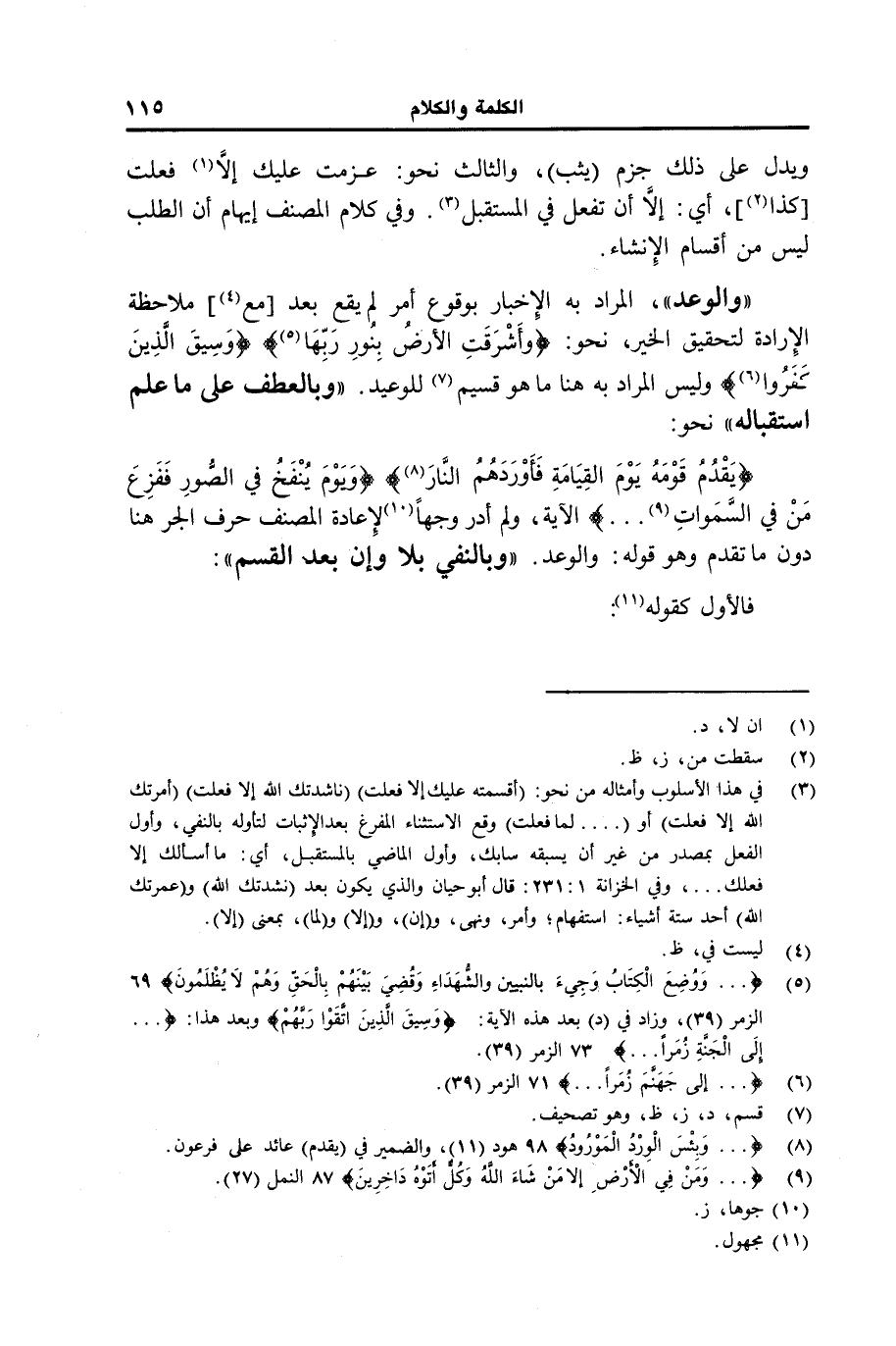 {يقدم قومه يوم القيامة فأوردهم النار} {ويوم ينفخ في السور ففزع من في السموات ... } الآية، ولم أدر وجها لإعادة المصنف حرف الجر هنا دن ما تقدم وهو قوله: والوعد. "وبالنفي بلا وإن بعد القسم": فالأول كقوله: