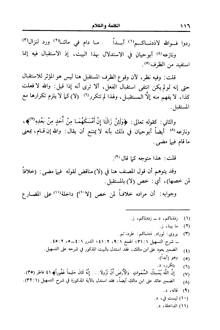 قلت: وفيه نظر، لأن وقوع الظرف المستقبل هنا ليس هو المؤثر للاستقبال حتى إنه لو لم يكن انتفى استقبال الفعل، ألا ترى أنه إذا قيل: والله لا فعلت كذا، لا يفهم منه إلا المستقبل، ولهذا لم تتكرر (لا) كما لا يلزم تكرارها مع المستقبل.
