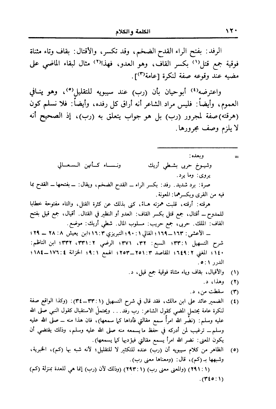 واعترضه أبو حيان بأن (رب) عند سيبويه للتقليل، وهو ينافي العموم، وأيضا: فليس مراد الشاعر أنه أراق كل رافده، وأيضا: فلا نسلم كون (هرقته) صفة لمجرور (رب) بل هو جواب يتعلق به (رب)، إذ الصحيح أنه لا يلزم وصف مجرورها.