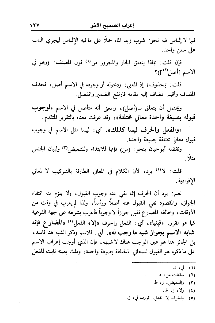 ويحتمل أن يتعلق بـ (أصل)، والمعنى أنه متأصل في الاسم "لوجوب قبوله بصيغة واحدة معاني مختلفة"، وقد عرفت معناه بالتقرير المتقدم.