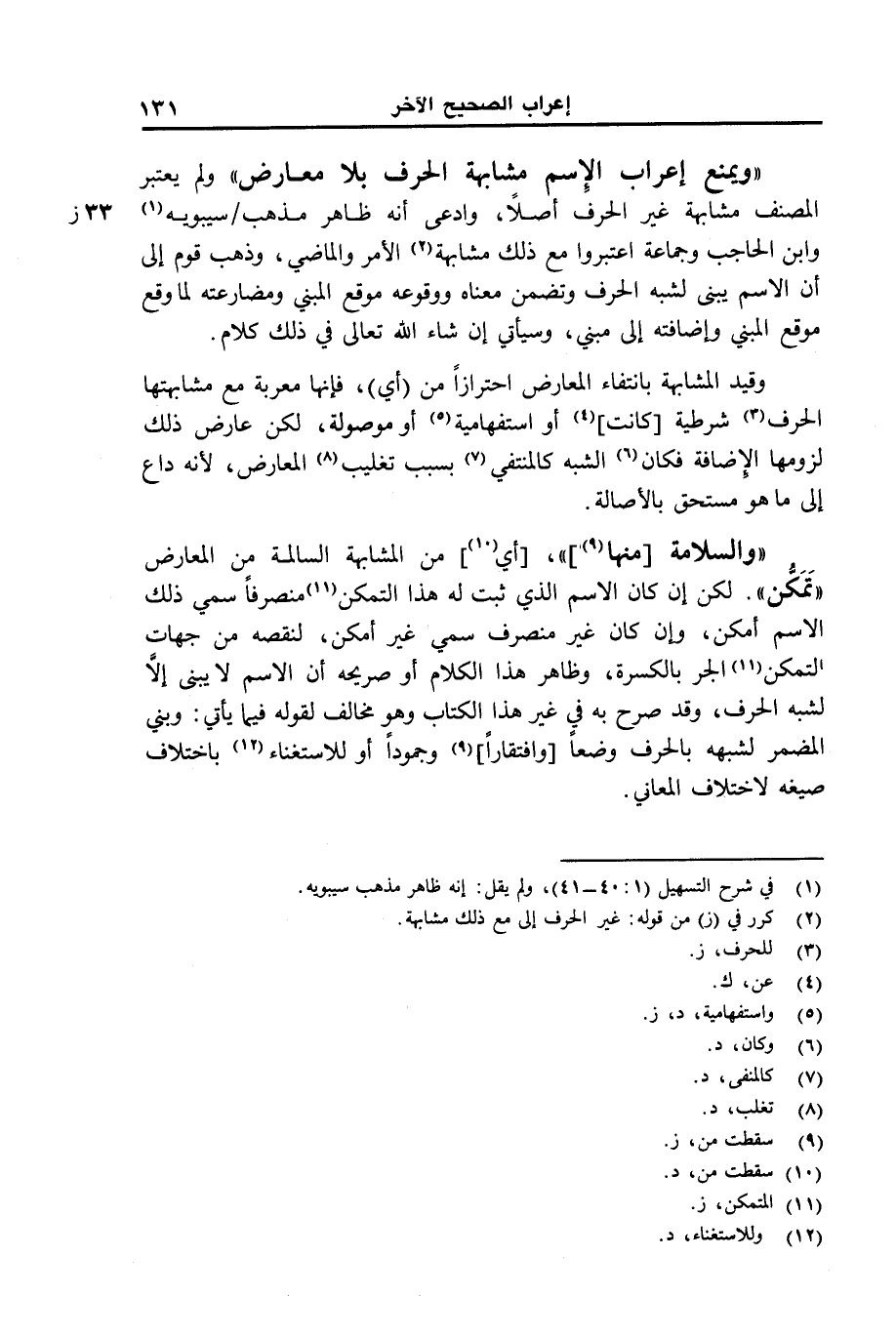 وقيد المشابهة بانتفاء المعارض احترازا ن (أي)، فإنها معربة مع مشابهتها الحرف شرطية [كانت] أو استفهامية وموصولة، لكن عارض ذلك لزومها الإضافة فكان الشبه كالمنتفي بسبب تغليب المعارض، لأنه داع على ما هو مستحق بالأصالة.