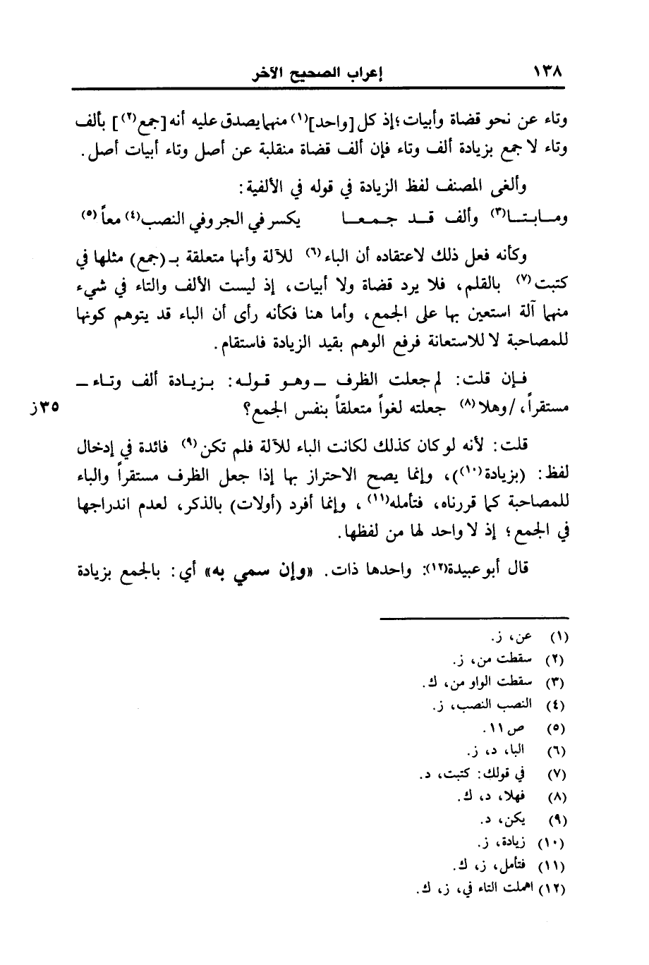 وكأنه فعل ذلك لاعتقاده أن الباء للآلة وأنها متعلقة بـ[جمع] مثلها في كتبت بالقلم، فلا يرد قضاة ولا أبيات، إذ ليست الألف والتاء في شيء منهما آلة استعين بها على الجمع، وأما هنا فكأنه رأى أن الباء قد يتوهم كونها للمصاحبة لا للاستعانة فرفع الوهم بقيد الزيادة فاستقام.