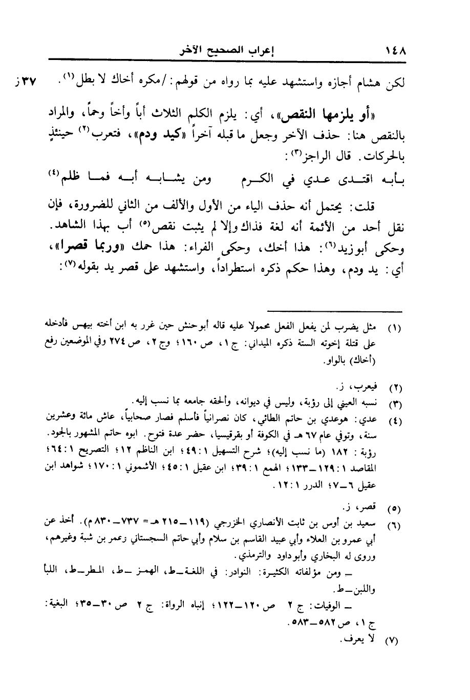 قلت: يحتمل أنه حذف الياء من الأول والألف من الثاني للضرورة، فإن نقل أحد من الأئمة أنه لغة فذاك وإلا لم يثبت نقص أب بهذا الشاهد.