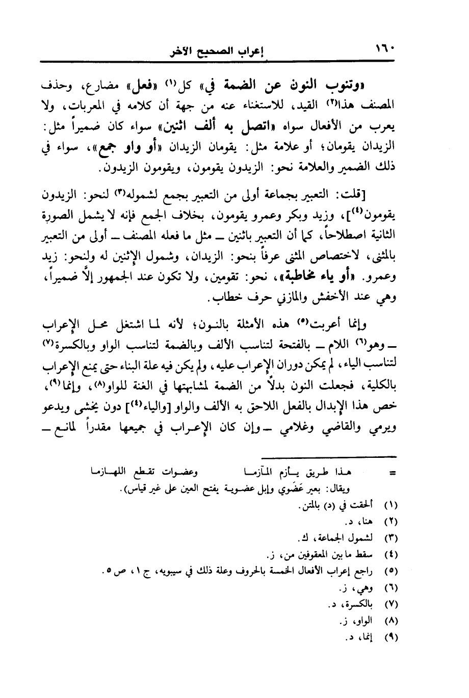 وإنما أعربت هذه الأمثلة بالنون؛ لأنه لما اشتغل محل الإعراب –وهو اللام- بالفتحة لتناسب الألف وبالضمة لتناسب الواو وبالكسرة لتناسب الياء، لم يمكن دوران الإعراب عليه، ولم يكن فيه علة البناء حتى يمنع الإعراب بالكلية، فجعلت النون بدلا من الضمة لمشابهتها في الغنة للواو، وإنما، خص هذا الإبدال بالفعل اللاحق به الألف والواو [والياء] دون يخشى ويدعو ويرمي والقاضي وغلامي –وإن كان الإعراب في جميعها مقدارا لمانع-