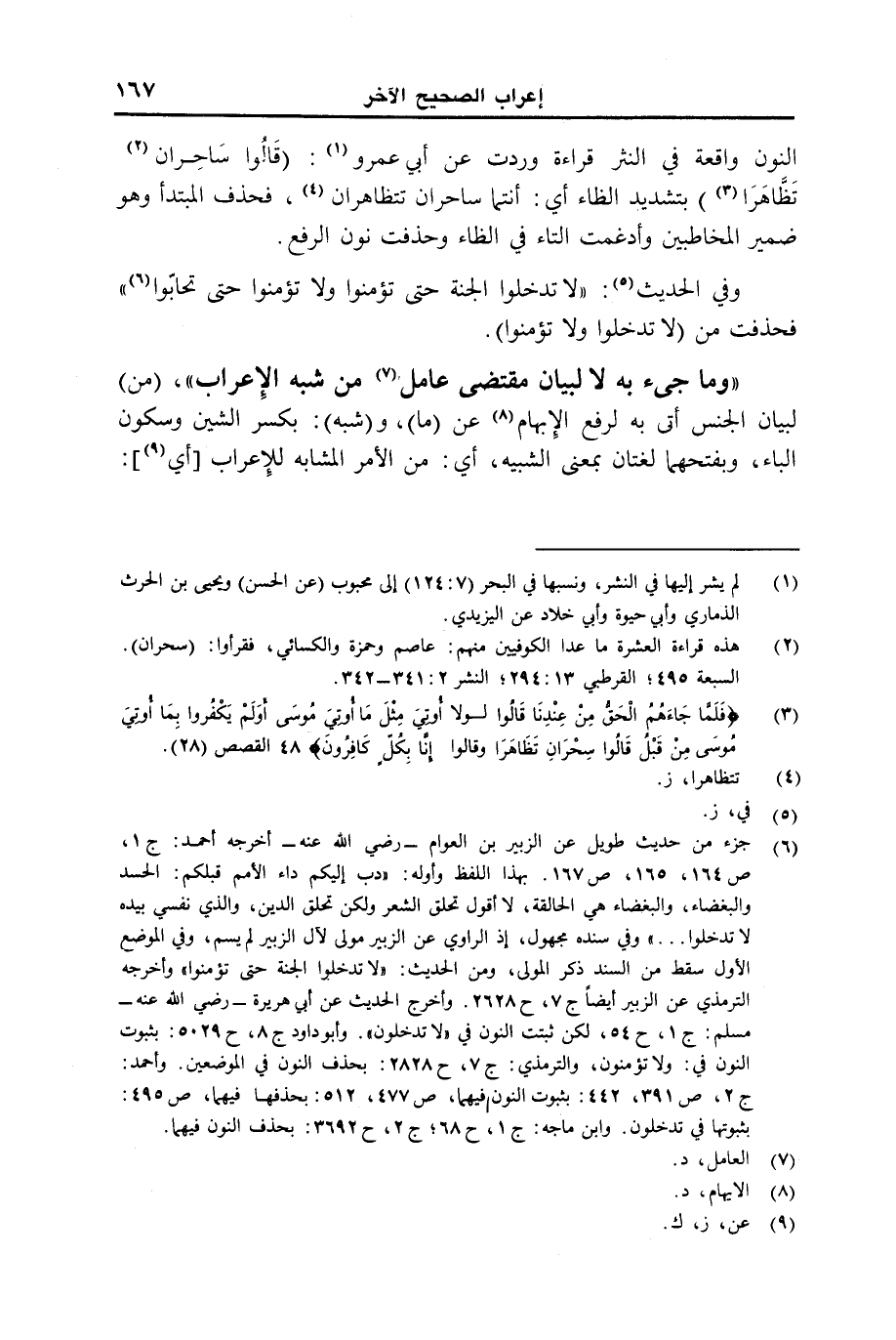 وفي الحديث: "لا تدخلوا الجنة حتى تؤمنوا ولا تؤمنوا حتى تحابوا" فحذفت من (لا تدخلوا ولا تؤمنوا).