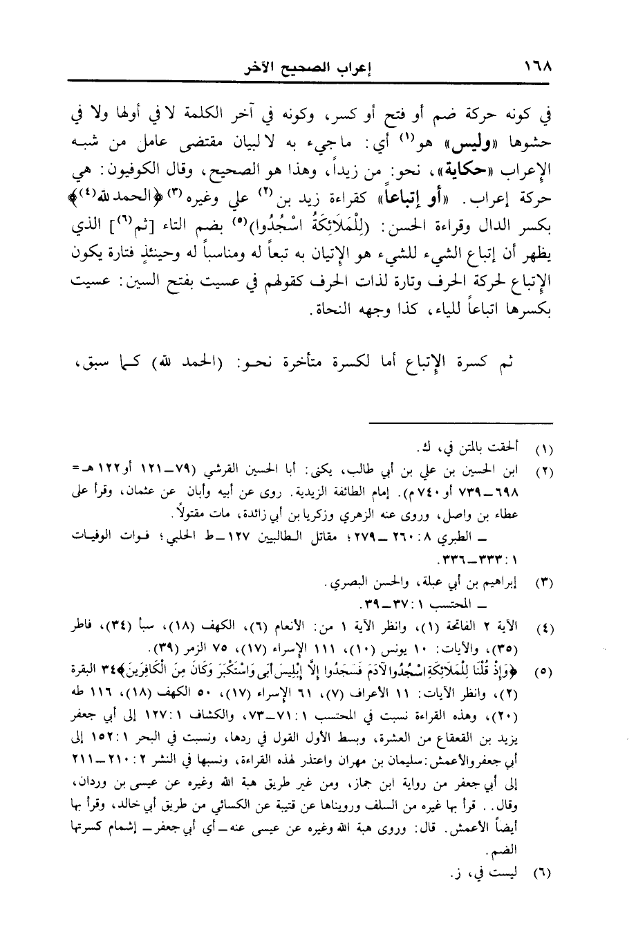 في كونه حركة ضم أو فتح أو كسر، وكونه في آخر الكلمة لا في أولها ولا في حشوها "ليس" هو أي: ما جيء به لا لبيان مقتضى عامل من شبه الإعراب "حكاية"، نحو: من زيدا، وهذا هو الصحيح، وقال الكوفيون: هي حركة إعراب. "أو إتباعا" كقراءة زيد ين علي وغيره {الحمد لله} بكسر الدال وقراءة الحسن: (للملائكة اسجدوا) بضم التاء [ثم] الذي يظهر أن إتباع الشيء للشيء هو الإتيان به تبعا له ومناسبا له وحينئذ فتارة يكون الإتباع لحركة الحرف وتارة لذات الحرف كقولهم في عسيت بفتح السين: عسيت بكسرها اتباعا للياء، كذا وجهه النحاة.