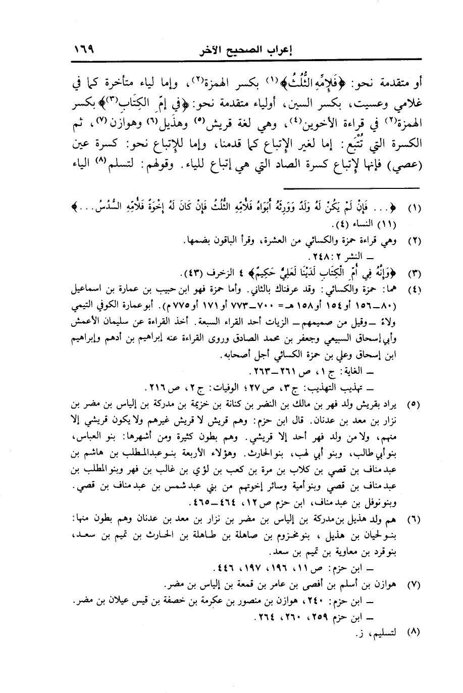 أو متقدمة نحو: {فلإمه الثلث} بكسر الهمزة، وإما لياء متأخرة كما في غلامي وعسيت، بكسر السين، أولياء متقدمة نحو: {في إم الكتاب} بكسر الهمزة في قراءة الأخوين، وهي لغة قريش وهذيل وهوازن، ثم الكسرة التي تتبع: إما لغير الإتباع كما قدمنا، وإما للإتباع نحو: كسرة عين (عصي) فإنها لإتباع كسرة الصاد التي هي إتباع للياء. وقولهم: لتسلم الياء