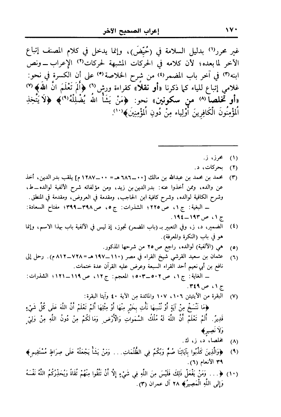 غير محرر بدليل السلامة في (حيض)، وإنما يدخل في كلام المصنف إتباع الآخر لما بعده؛ لأن كلامه في الحركات المشبهة لحركات الإعراب –ونص ابنه في آخر باب المضمر من شرح الخلاصة على أن الكسرة نحو: غلامي إتباع للياء كما ذكرنا "أو نقلا" كقراءة ورش {ألم تعلم ان الله} "أو تخلصا من سكونين" نحو: {من يشأ الله يضلله} {لا يتخذ المؤمنون الكافرين أولياء من دون المؤمنين}.