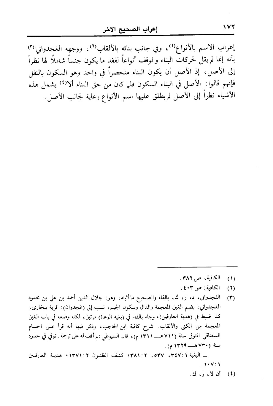 إعراب الاسم بالأنواع، وفي جانب بنائه بالألقاب، ووجهه الغجدواني بأنه إنما لم يقل لحركات البناء والوقف أنواعا لفقد ما يكون جنسا شاملا لها نظرا إلى الأصل، إذ الأصل أن يكون البناء منحصرا في واحد وهو السكون بالنقل فإنهم قالوا: الأصل في البناء السكون فلما كان من حق البناء ألا يشمل هذه الأشياء نظرا إلى الأصل لم يطلق عليها اسم الأنواع رعاية لجانب الأصل.