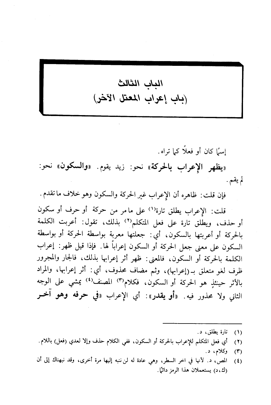 "يظهر الإعراب بالحركة" نحو: زيد يقوم. "والسكون" نحو: لم يقم.