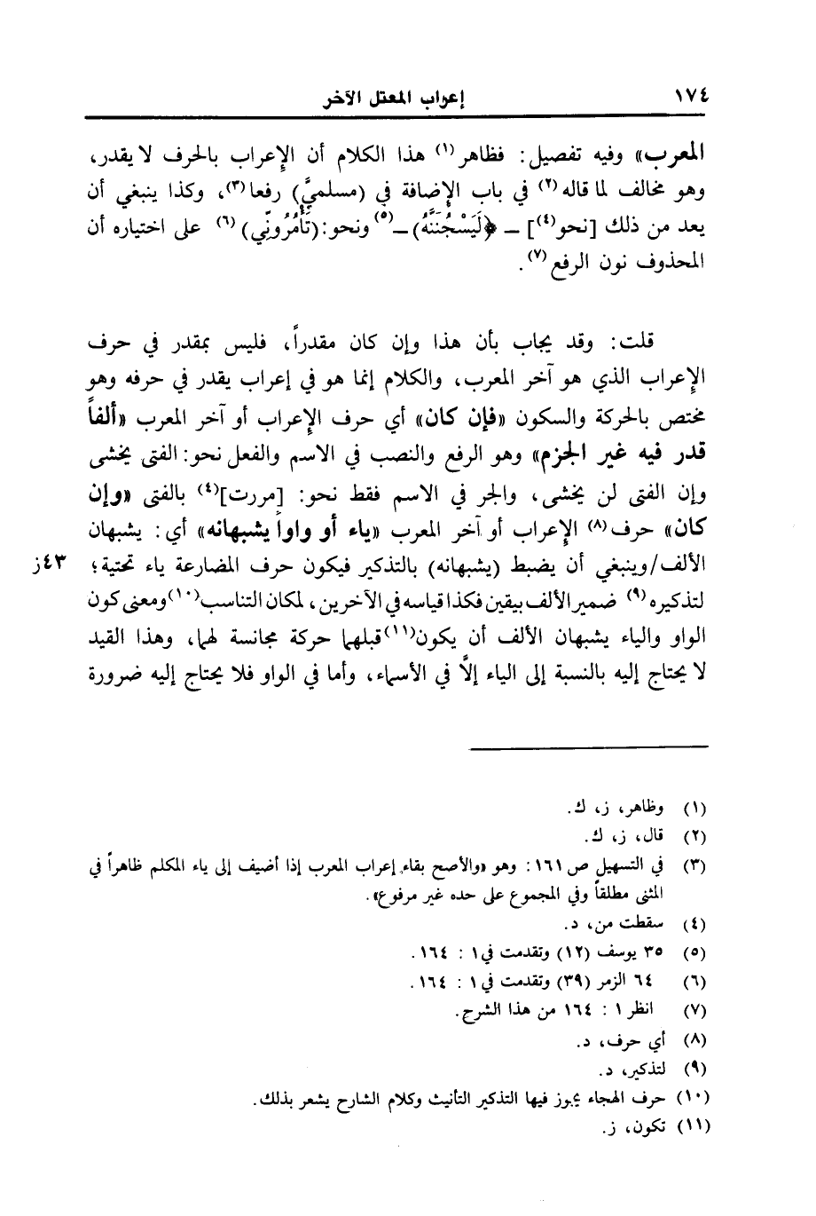 المعرب" وفيه تفصيل: فظاهر هذا الكلام أن الإعراب بالحرف لا يقدر، وهو مخالف لما قاله في باب الإضافة في (مسلمي) رفعا، وكذا ينبغي أن يعد من ذلك [نحو] – {ليسجننه) – وحو: (تأمروني) على اختياره أن المحذوف نون الرفع.