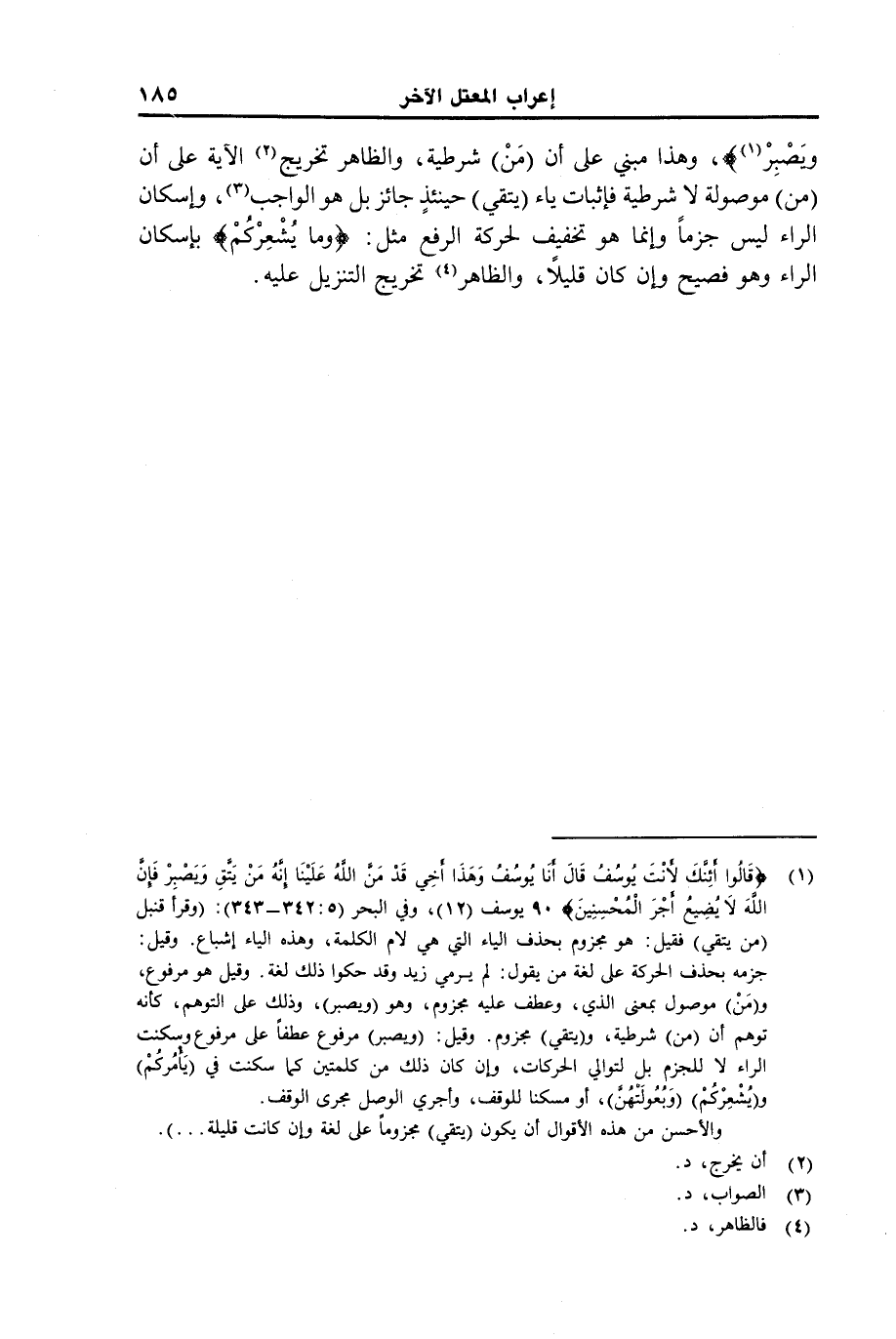 ويصبر}، وهذا مبني على أن (من) شرطية، والظاهر تخريج الآية على أن (من) موصولة لا شرطية فإثبات ياء (يتقي) حينئذ) جائز بل هو الواجب، وإسكان الراء ليس جزما وإنما هو تخفيف لحركة الرفع مثل: {وما يشعركم} بإسكان الراء وهو فصيح وإن كان قليلا، وتخريج التنزيل عليه.