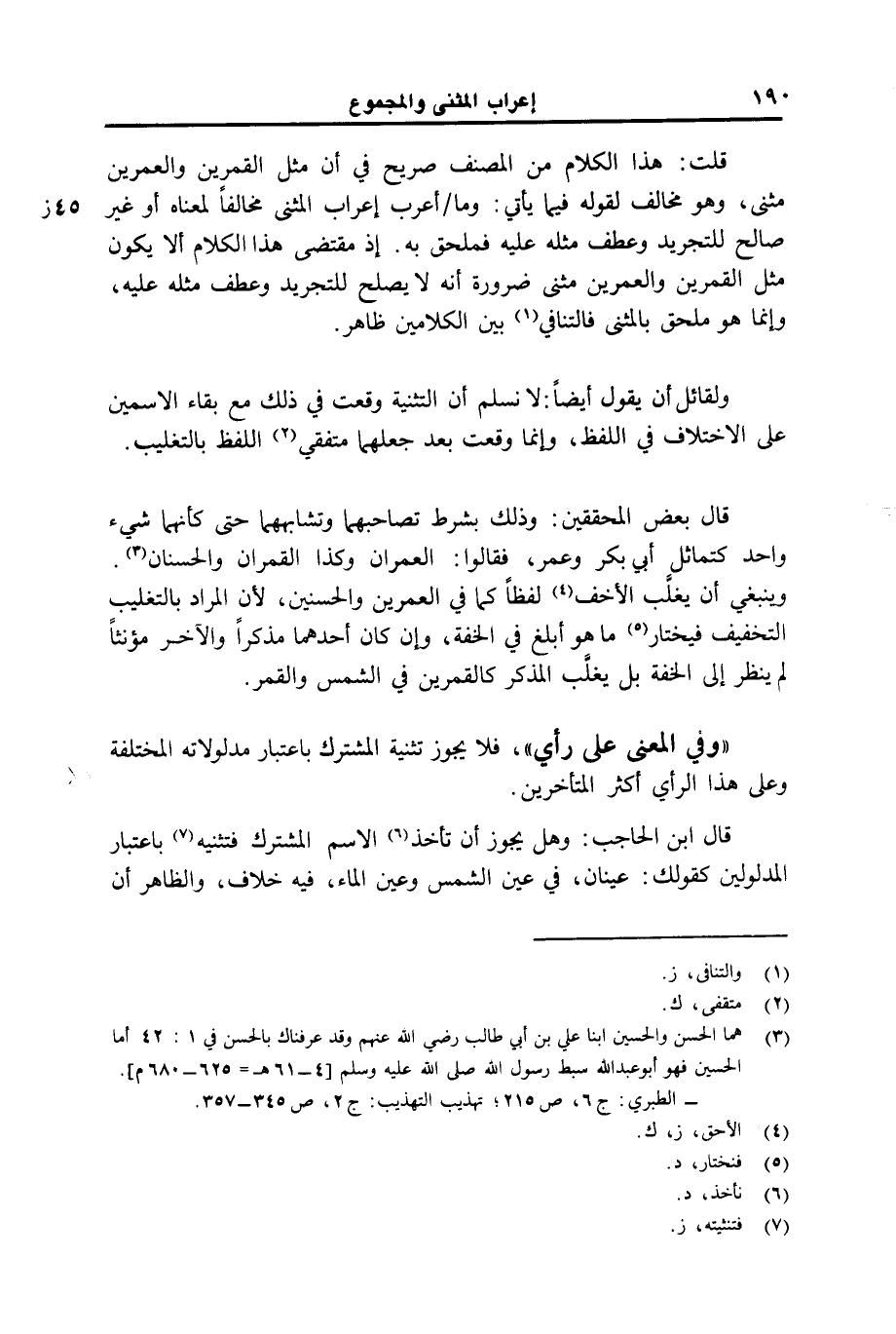 قال بعض المحققين: وذلك بشرط تصاحبهما وتشابههما حتى كأنها شيء واحد كتماثل أبي بكر وعمر، فقالوا: العمران وكذا القمران والحسنان وينبغي أن يغلب الأخف لفظا كما في العمرين والحسنين، لأن المراد بالتغليب التخفيف فيختار ما هو أبلغ في الخفة بل يغلب المذكر كالقمرين في الشمس والقمر.