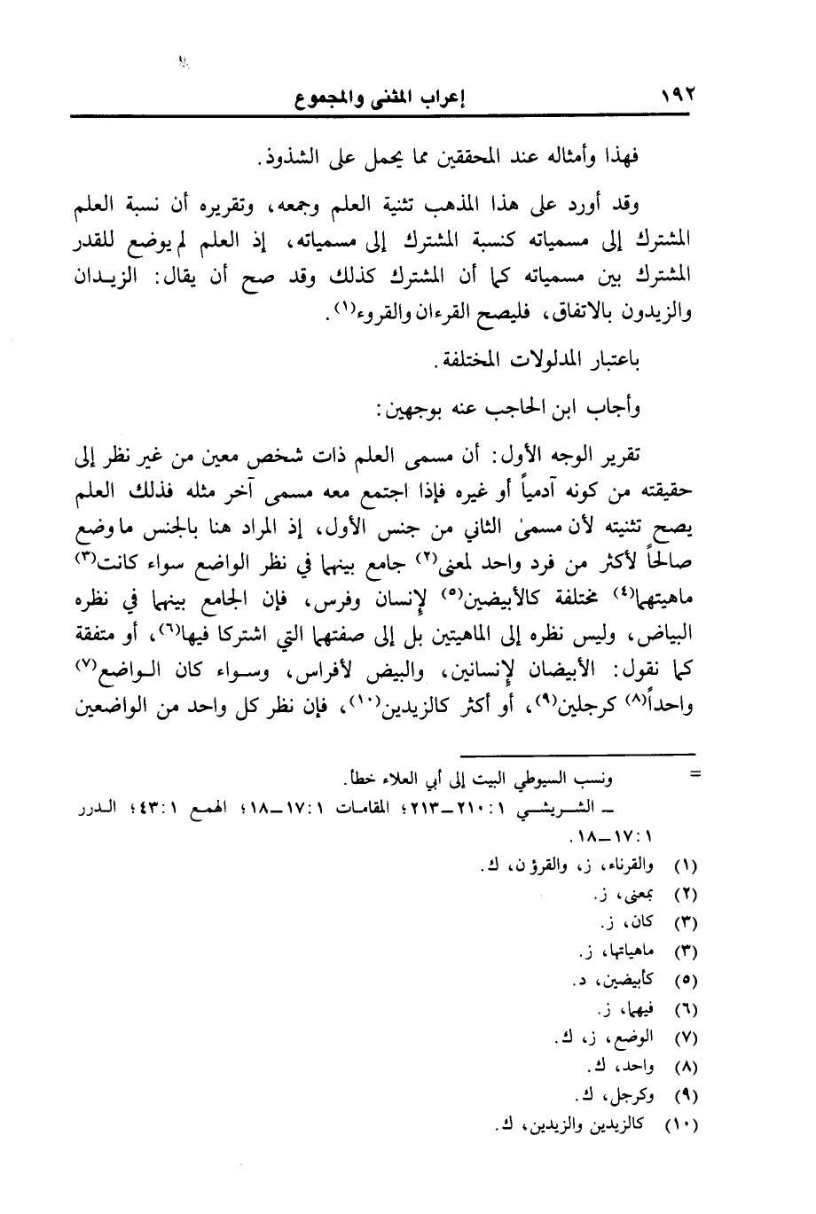 وقد اورد على هذا المذهب تثنية العلم وجمعه، وتقريره أن نسبة العلم المشترك إلى مسمياته كنسبة المشترك إلى مسمياته، إذ العلم لم يوضع للقدر المشترك بين مسمياته كما أن المشترك كذلك وقد صح أن يقال: الزيدان والزيدون بالاتفاق، فليصح القرءان والقروء.