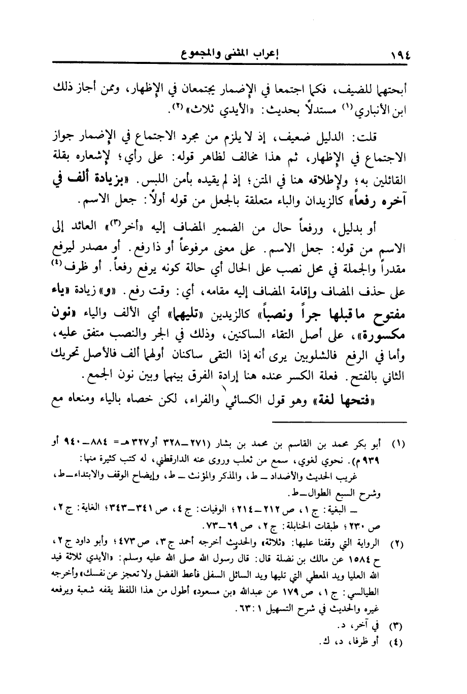 أو بدليل/ ورفعا حال من الضمير المضاف إليه "أخر" العائد إلى الاسم من قوله: جعل الاسم. على معنى مرفوعا أو ذا رفع. أو مصدر ليرفع مقدرا والجملة في محل نصب على الحال أي حالة كونه يرفع رفعا. أو ظرف على حذف المضاف وإقامة المضاف إليه مقامه، أي: وقت رفع. "و" زيادة "ياء مفتوح ما قبلها جرا ونصبا" كالزيدين "تليهما" أي الألف والياء "نون مكسورة"، على أصل التقاء الساكنين، وذلك في الجر والنصب متفق عليه، وأما في الرفع فالشلوبين يرى أنه إذا التقى ساكنان أولهما ألف فالأصل تحريك الثاني بالفتح. فعلة الكسر عنده هنا إرادة الفرق بينهما وبين نون الجمع. "فتحها لغة" وهو قول الكسائي والفراء، لكن خصاه بالياء ومنعاه مع