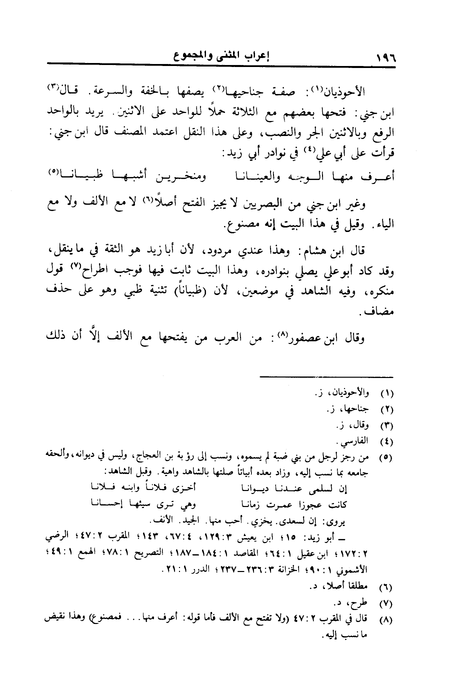 الأحوذان: صفة جناحيها يصفها بالخفة والسرعة. قال ابن جني: فتحها بعضهم مع الثلاثة حملا للواحد على الاثنين. يريد بالواحد الرفع وبالاثنين الجر والنصب، وعلى هذا النقل اعتمد المصنف قال ابن جني: قرأت على أبي علي في نوادر أبي زيد: