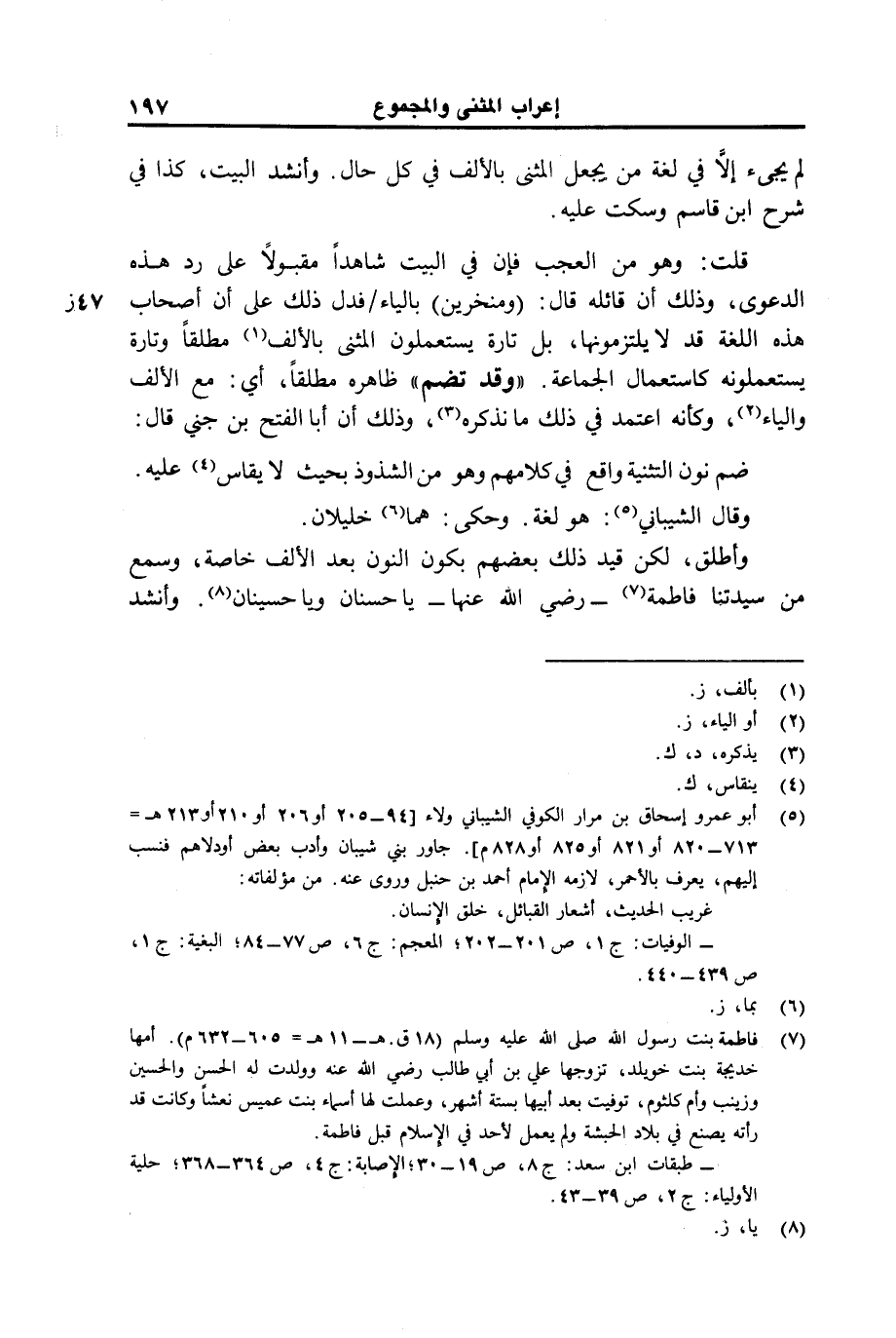 وأطلق، لكن قيد ذلك بعضهم بكون النون بعد الألف خاصة، وسمع من سيدتنا فاطمة –رضي الله عنها- ياحسنان وياحسينان. وأنشد