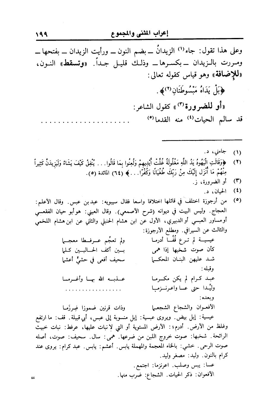 وعلى هذا تقول: جاء الزيدان –بضم النون- ورأيت الزيدان-بفتحها ومررت بالزيدان –بكسرها- وذلك قليل جدا. "وتسقط" النون، "للإضافة" وهو قياس كقوله تعالى: