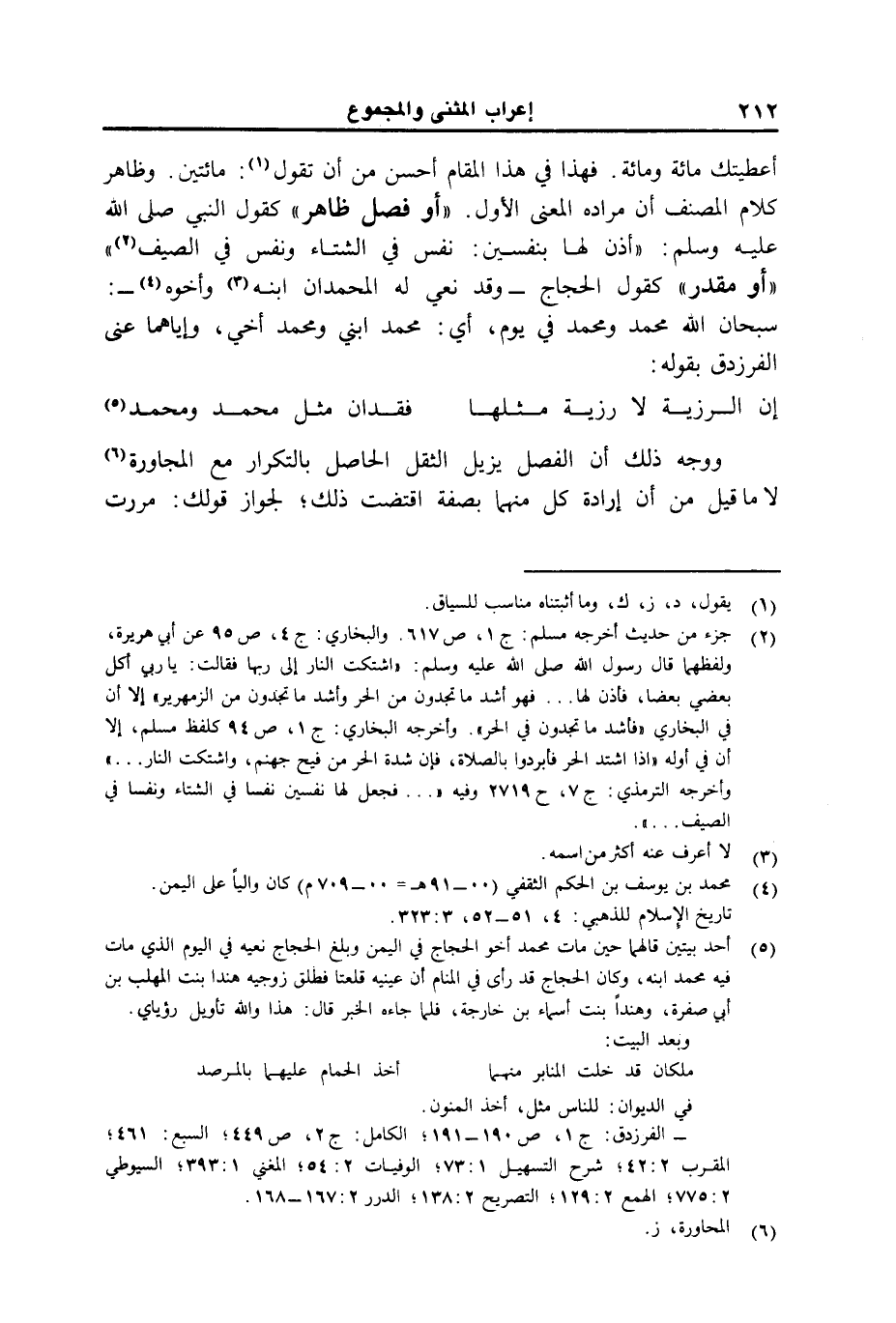 أعطيتك مائة ومائة. فهذا في هذا المقام أحسن من أن تقول: مائتين. وظاهر كلام المصنف أن مراده المعنى الأول. "أو فصل ظاهر" كقول النبي صلى الله عليه وسلم: "أذن لها بنفسين: نفس في الشتاء ونفس في الصيف" "أو مقدر" كقول الحجاج –وقد نعى له المحمدان ابنه وأخوه-: سبحان الله محمد ومحمد في يوم، أي: محمد ابني ومحمد أخي، وإياهما عني الفرزدق بقوله: