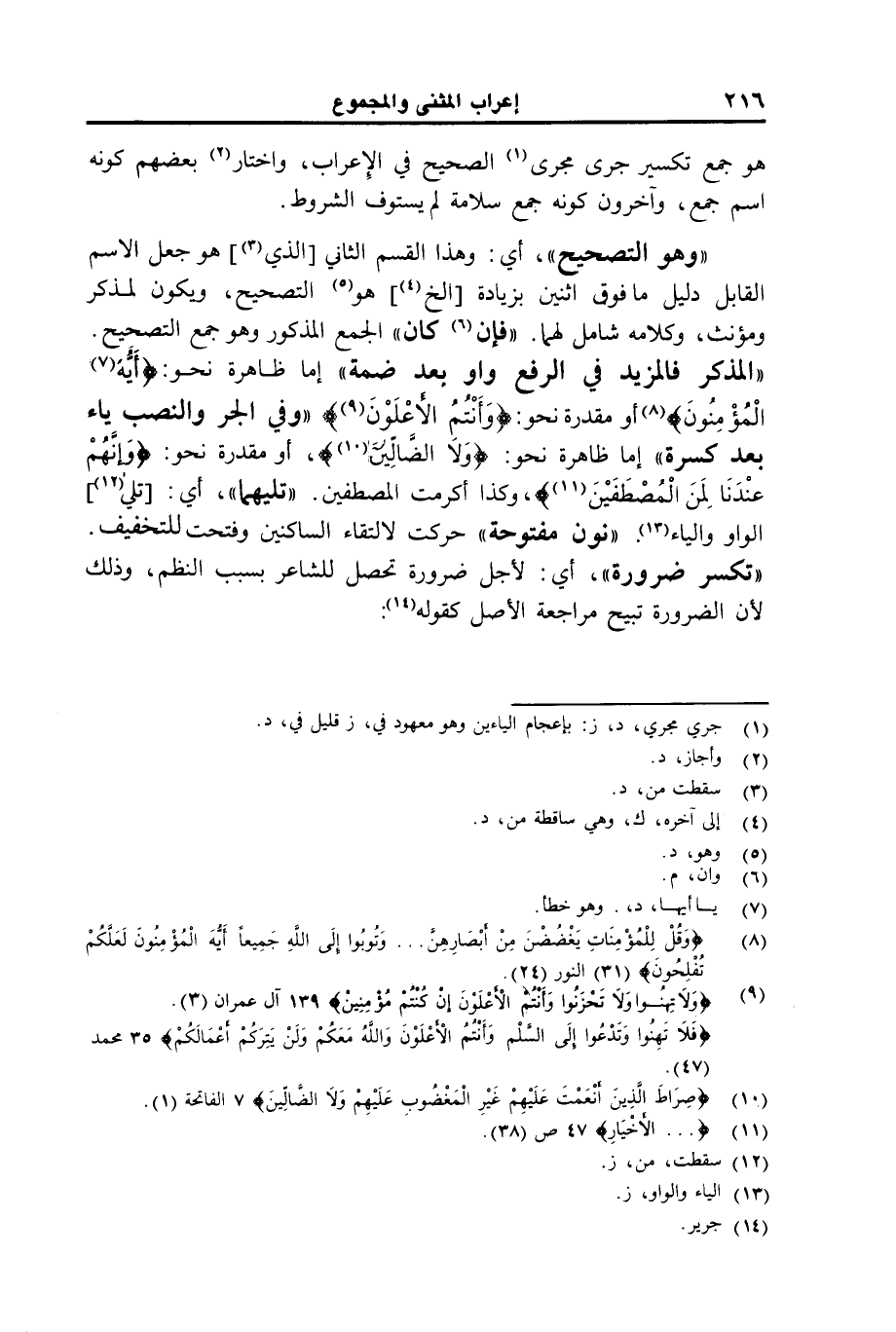 "المذكر فالمزيد في الرفع واو بعد ضمة" إما ظاهرة نحو: {أية المؤمنون} أو مقدرة نحو: {وأنتم الأعلون} "وفي الجر والنصب ياء بعد كسرة" إما ظاهرة نحو: {ولا الضالين}، أو مقدرة نحو: {وإنهم عندنا لمن المصطفين}، وكذا أكرمت المصطفين. "تليهما"، أي: [تلي] الواو والياء.