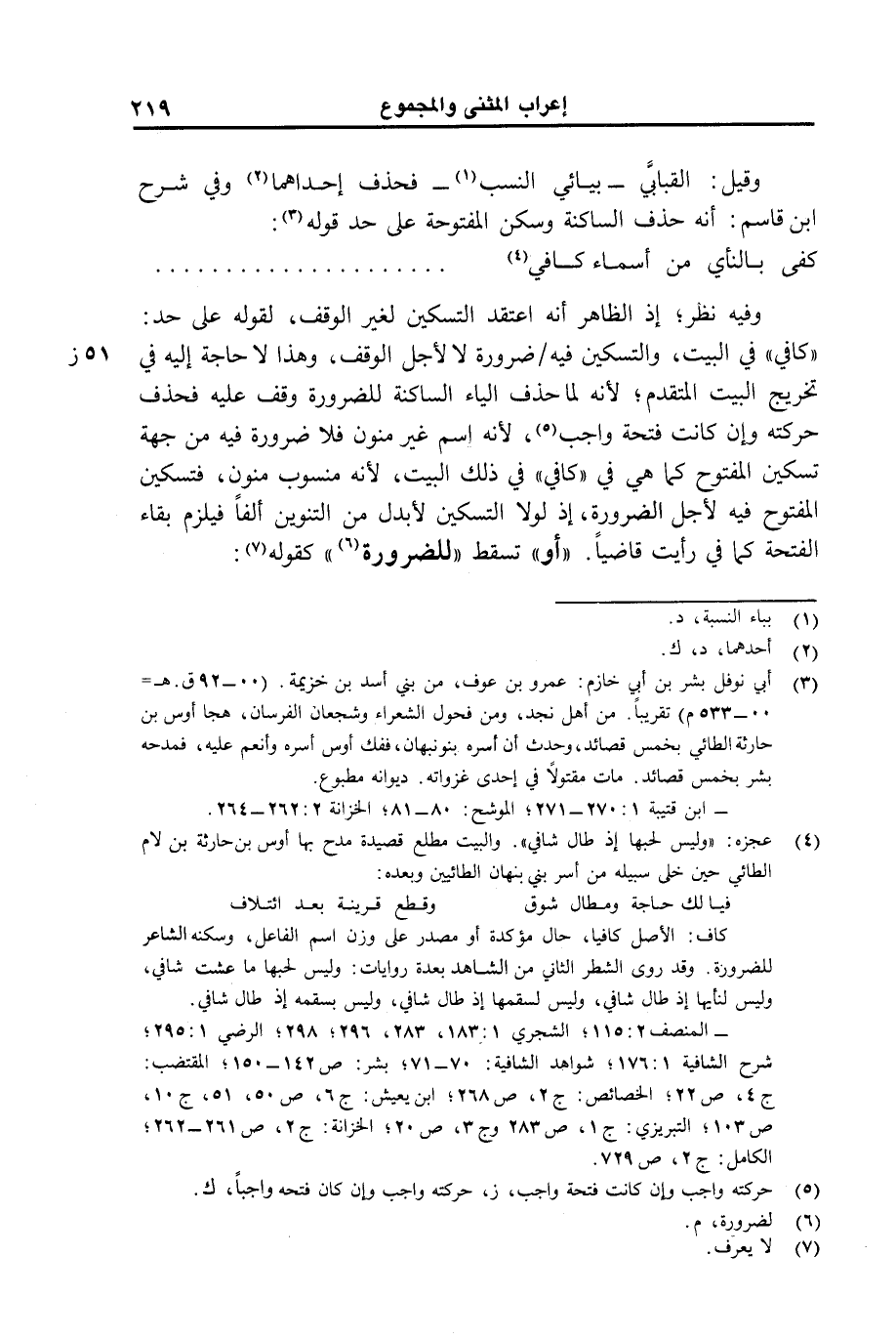 "كافي" البيت، والتسكين فيه/ ضرورة لا لأجل الوقف، وهذا لا حاجة إليه في تخريج البيت المتقدم؛ لأنه لما حذف الياء الساكنة للضرورة وقف عليه فحذف حركته وإن كانت فتحة واجب، لأنه اسم غير منون فلا ضرورة فيه من جهة تسكين المفتوح كما هي في "كافي" في ذلك البيت، لأنه منسوب منون، فتسكين المفتوح فيه لأجل الضرورة، إذ لولا التسكين لأبدل من التنوين ألفا فيلزم بقاء الفتحة كما في رأيت قاضيا. "أو" تسقط "للضرورة" كقوله: