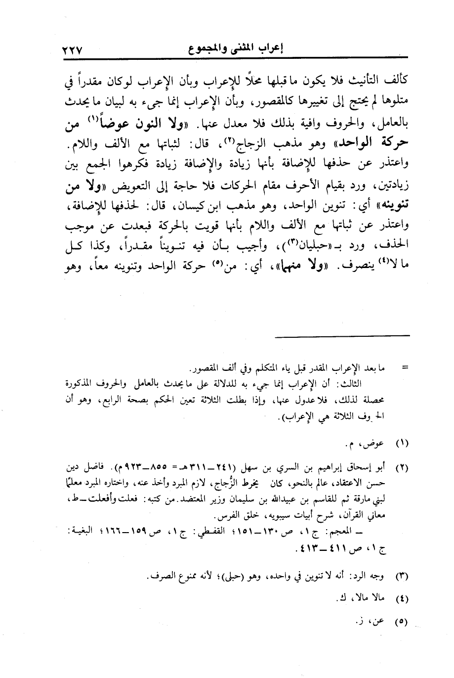"ولا النون عوضا من حركة الواحد" وهو مذهب الزجاج، قال: لثباتها مع الألف واللام. واعتذر عن حذفها للإضلافة بأنها زيادة فكرهوا الجمع بين زيادتين، ورد بقيام الحرف مقام الحركات فلا حاجة إلى التعويض "ولا من تنوينه" أي: تنوين الواحد، وهو مذهب ابن كسيان، قال: لحذفها للإضافة، واعتذر عن ثباتها مع الألف واللام بأنها قويت بالحركة فبعدت عن موجب الحذف، ورد بـ "حبليان"، وأجيب بأن فيه تنوينا مقدراـ وكذا كل مالا ينصرف. " ولا منهما"، أي: من حركة الواحد وتنوينه معا، وهو