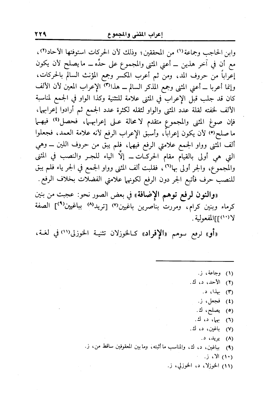 "والنون لرفع توهم الإضافة" في بعض الصور نحو: عجبت من بنين كرماء وبنين كرام، ومررت بناصرين باغيين [تريد بباغيين] الصفة لا]] المفعولية.