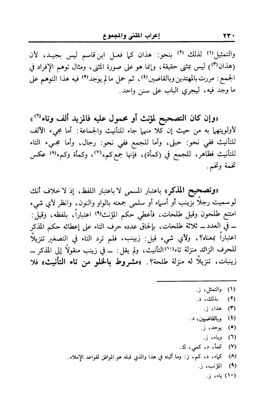 والتمثيل لذلك بنحو: هذان كما فعل ابن قاسم ليس بجيد، لأن (هذان) ليس بمثنى حقيقة، وإنما هو على صورة المثنى، ومثال توهم الإفراد في الجمع: مررت بالمهتدين وبالقاضين، ثم حمل ما لم يوجد فيه هذا التوهم على ما وجد فيه، ليجري الباب على سنن واحد.