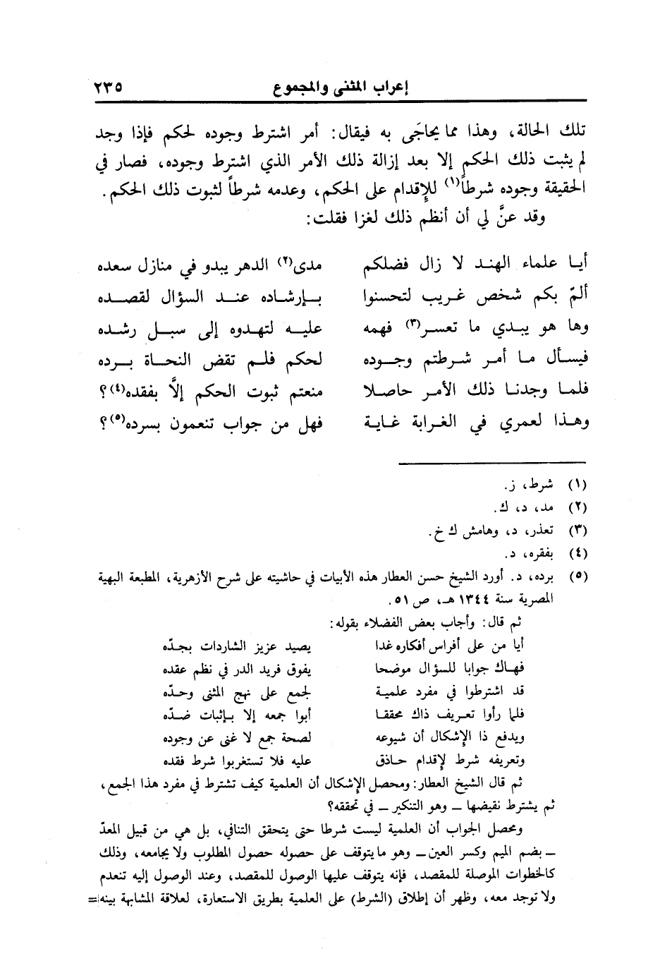 تلك الحالة، وهذا مما يحاجي به فيقال: أمر اشترط وجوده لحكم فإذا وجد لم يثبت ذلك الحكم إلا بعد إزالة ذلك الأمر الذي اشترط وجوده، فصار في الحقيقة وجوده شرطا للإقدام على الحكم، وعدمه شرطا لثبوت ذلك الحكم. وقد عن لي أن أنظم ذلك لغزا فقلت: