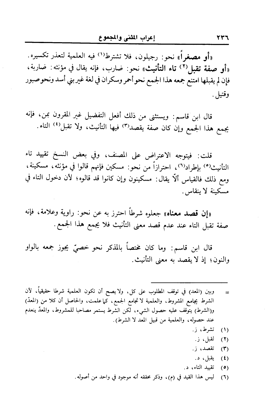 قلت: فيتوجه الاعتراض على المصنف، وفي بعض النسخ تقييد تاء التأنيث بإطراد، احترازا من نحو: مسكين فإنهم قالوا في مؤنثه، مسكينة، ومع ذلك فالقياس ألا يقال: مسكينون وإن كانوا قد قالوه؛ لأن دخول التاء في مسكينة لا ينقاس.