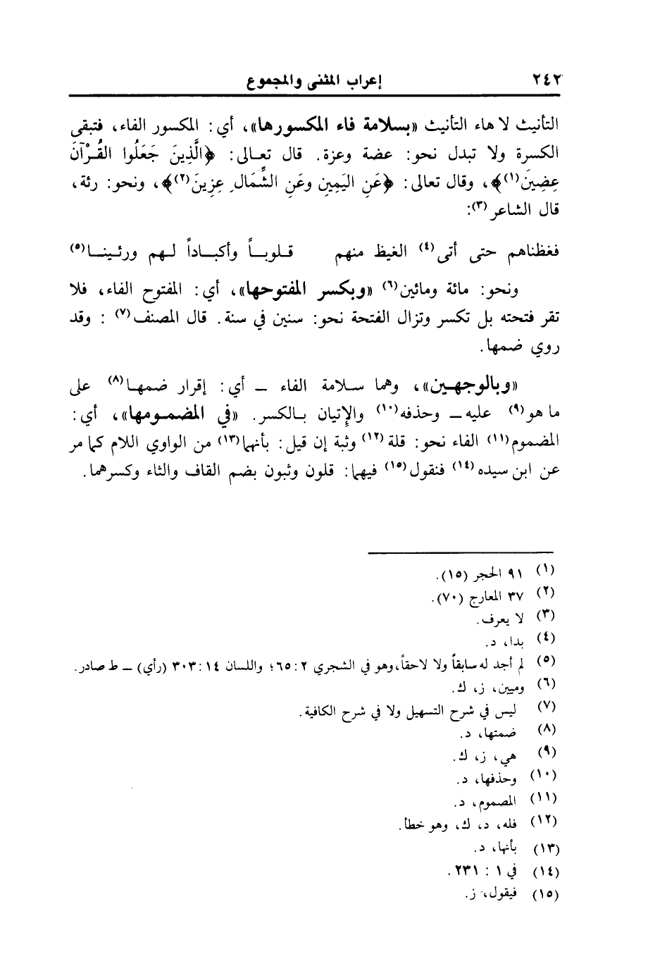 التأنيث لا هاء التأنيث "بسلامة فاء المكسورها"، أي: المكسور الفاء، فتبقى الكسرة ولا تبدل نحو: عضة وعزة. قال تعالى: {الذين جعلوا القرآن عضين}، وقال تعالى: {عن اليمين وعن الشمال عزين}، ونحو: رئة، قال الشاعر: