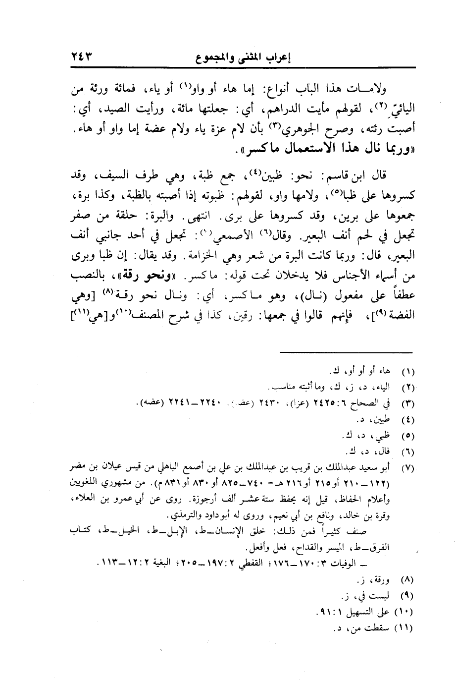قال ابن قاسم: نحو: ظبين، جمع ظبة، وهي طرف السيف، وقد كسروها على ظبا، ولامها واو، لقولهم: ظبوته إذا أصبته بالظبة، وكذا برة، جمعوها على برين، وقد كسروها على برى. انتهى. والبرة: حلقة من صفر تجعل في لحم أنف البعير. وقال الأصمعي: تجعل في احد جانبي أ، ف البعير، قال: وربما كانت البرة من شعر وهي الخزامة. وقد يقال: إن ظبا وبرى من أسماء الأجناس فلا يدخلان تحت قوله: ما كسر. "ونحو رقة"، بالنصب عطفا على مفعول (نال)، وهو ما كسر، أي: ونال نحو رقة [وهي الفضة]، فإنهم قالوا في جمعها: رقين، كذا في شرح المصنف و [هي]