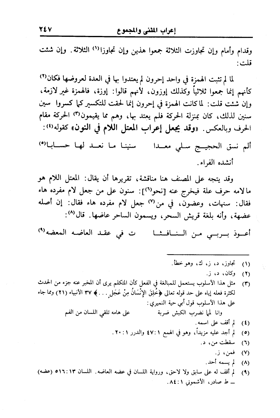 لما لم تثبت الهمزة في واحد إحرون لم يعتدوا بها في العدة لعروضها فكان كأنهم إنما جمعوا ثلاثيا وكذلك إوزون، لأنهم قالوا: إوزة، فالهمزة غير لازمة، وإن شئت قلت: لما كانت الهمزة في إحرون إنما لحقت للتكسير كما كسروا سين سنين لذلك، كان بمنزلة الحركة فلم يعتد بها، وهم مما يقيمون الحركة مقام الحرف وبالعكس. "وقد يجعل إعراب المعتل اللام في النون" كقوله: