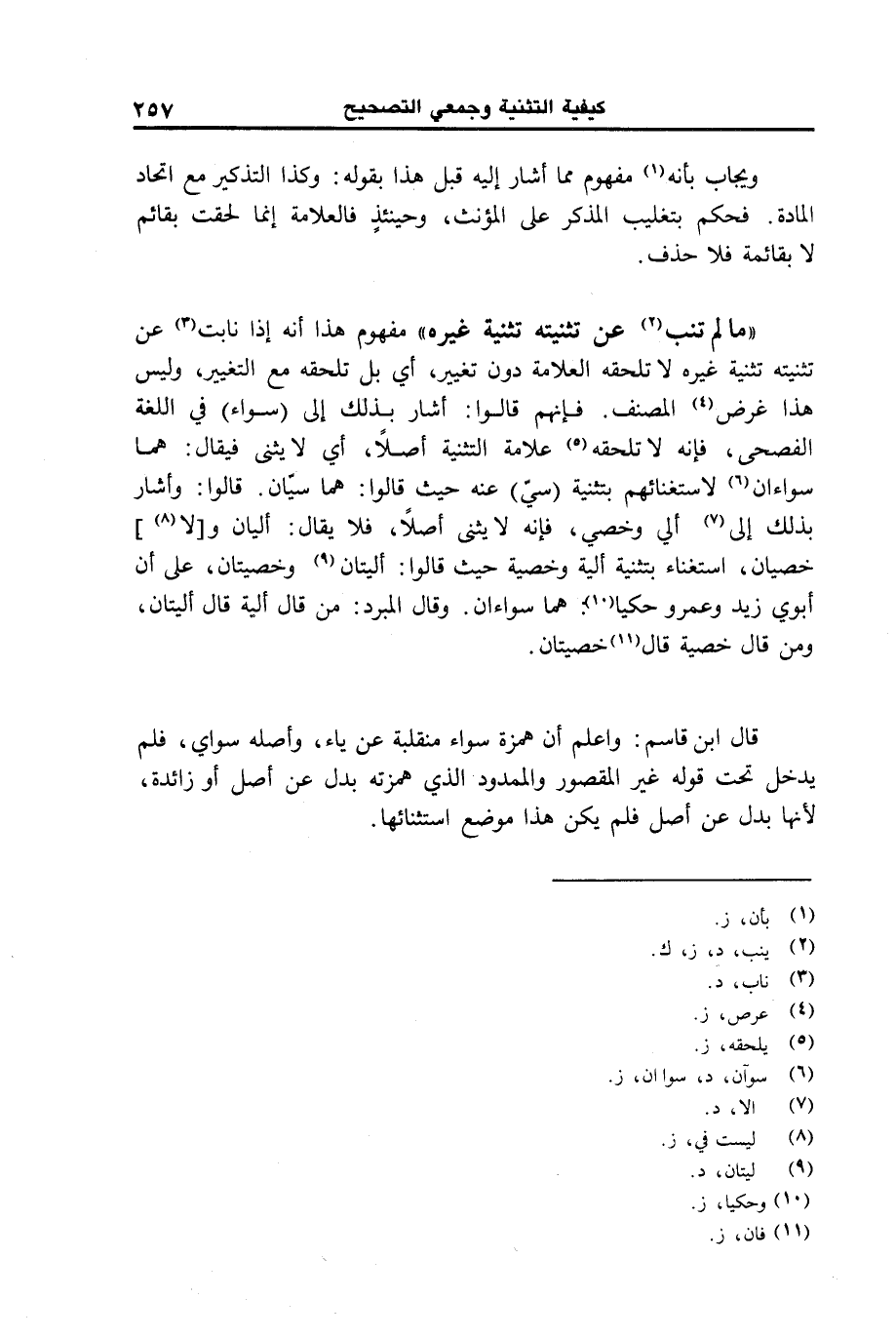 "ما لم تنب عن تثنية غيره" مفهوم هذا أنه إذا نابت عن تثنيته تثنية غيره لا تلحقه العلامة دون تغيير، أي بل تلحقه مع التغيير، وليس هذا غرض المصنف. فإنهم قالوا: أشار بذلك إلى (سواء) في اللغة الفصحى، فإنه لا تلحقه علامة التثنية أصلا، أي لا يثنى فيقال: هما سواءان لاستغنائهم بتثنية (سي) عنه حيث قالوا: هما سيان. قالوا: وأشار بذلك إلى ألي وخصي، فإنه لا يثنى أصلا، فلا يقال: أليان و [لا] خصيان، استغناء بتثنية ألية وخصية حيث قالوا: أليتان وخصيتان، على أن أبوي زيد وعمرو حكيا: هما سواءان. وقال المبرد: من قال ألية قال أليان، ومن قال خصية قال خصيتان.