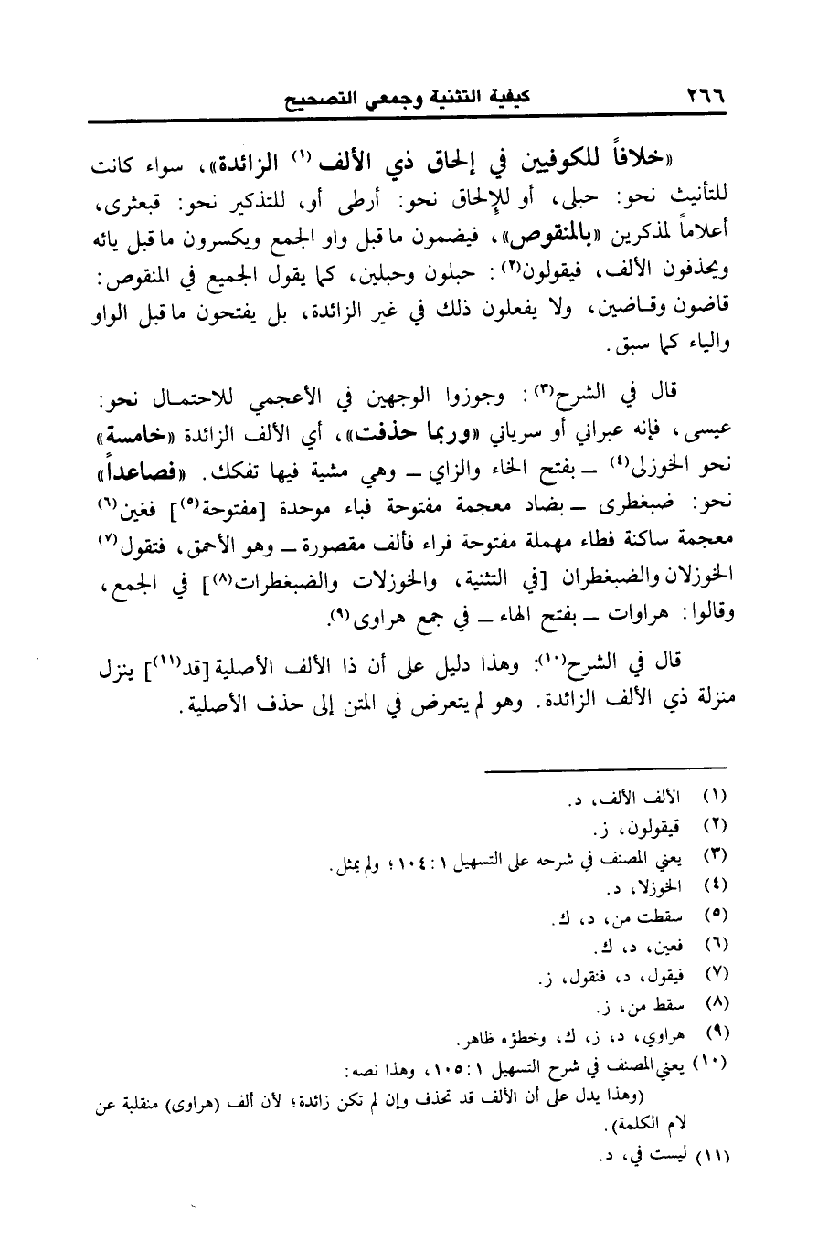 "خلافا للكوفيين في إلحاق ذي الألف الزائدة"، سواء كانت للتأنيث نحو: حبلى، أو للإلحاق نحو: أرطى أو، للتذكير نحو: قبعثرة، أعلاما لمذكرين "بالمنقوص"، فيضمون ما قبل واو الجمع ويكسرون ما قبل يائه ويحذفون الألف، فيقولون: حبلون وحبلين، كما يقول الجميع في المنقوص: قاضون وقاضين، ولا يفعلون ذلك في غير الزائدة، بل يفتحون ما قبل الواو والياء كما سبق.
