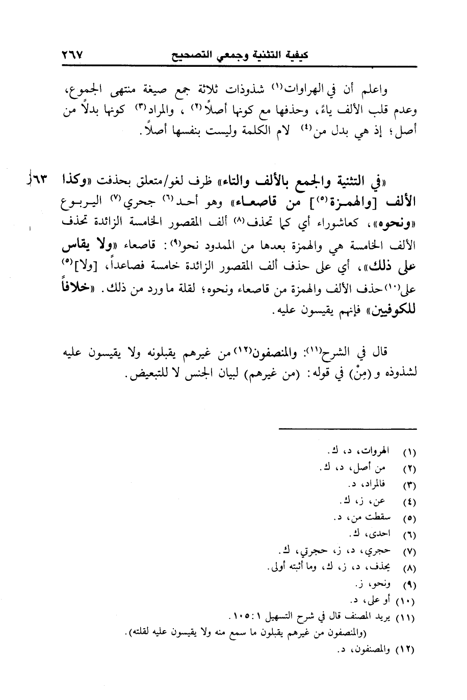 "وفي التثنية والجمع باللف والتاء" ظرف لغو/متعلق بحذفت "وكذا الألف [والهمزة] من قاصعاء" وهو أحد جحري اليربوع "ونحوه"، كعاشوراء أي كما تحذف ألف المقصور الخامسة الخامسة الزائدة تحذف الألف الخامسة هي الهمزة بعدها من الممدود نحو: قاصعاء "ولا يقاس على ذلك"، أي على حذف ألف المقصور الزائدة خامسة فصاعدا، [ولا] على حذف الألف والهمزة من قاصعاء ونحوه؛ لقلة ما ورد من ذلك. "خلافا للكوفيين" فإنهم يقيسون عليه.