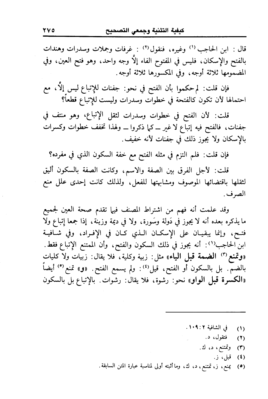 قال: ابن الحاجب وغيره، فنقول: غرفات وجملات وسدرات وهندات بالفتح والإسكان، فليس في المفتوح الفاء إلا جه واحد، وهو فتح العين، وفي المضمومها ثلاثة أوجه، وفي المكسورها ثلاثة أوجه.