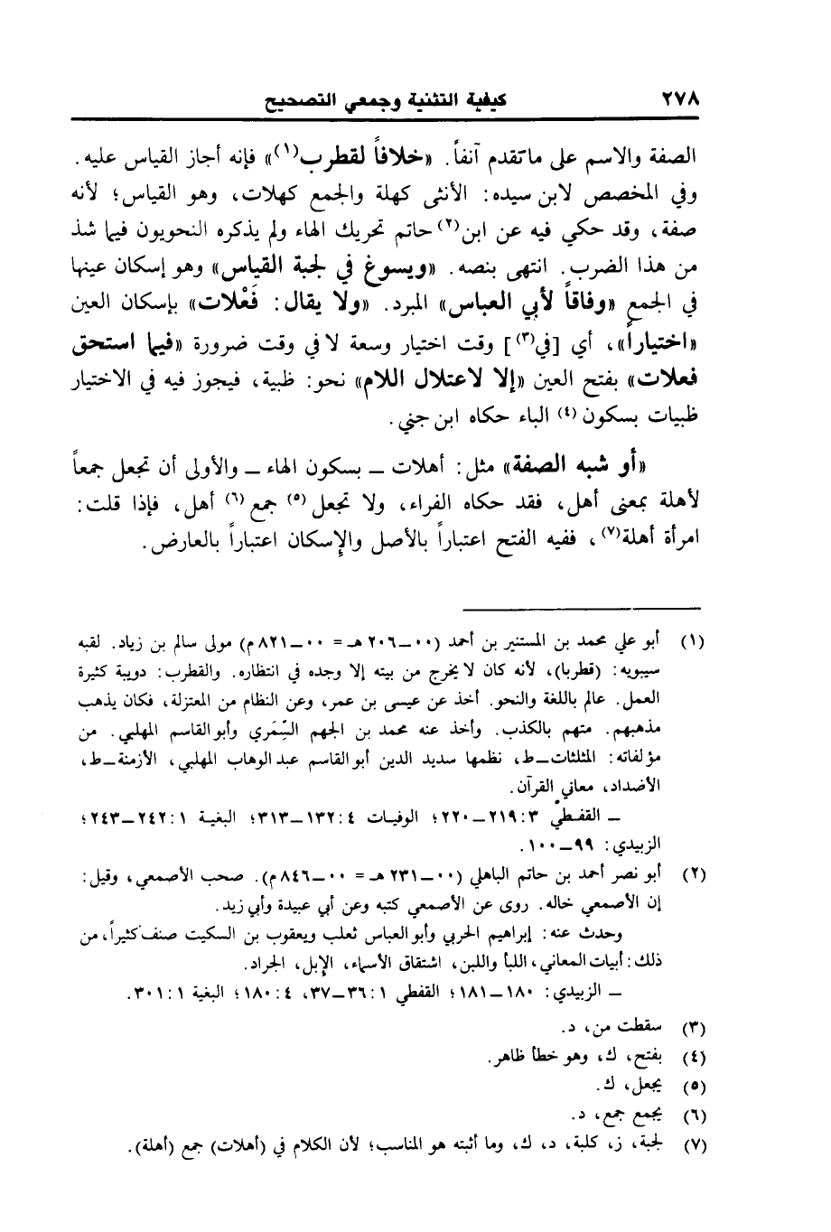 "أو شبه الصفة" مثل: أهلات –بسكون الهاء- والأولى أن تجعل جمعا لأهله بمعنى أهل، فقد حكاه الفراء، ولا تجعل جمع أهل، فإذا قلت: امرأة أهلة، ففيه الفتح اعتبارا بالأصل والإسكان اعتبارا بالعارض.