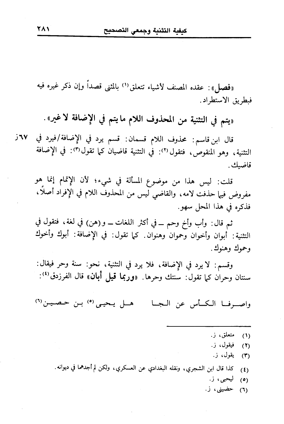 قال ابن قاسم: محذوف اللام قسمان: قسم يرد في الإضافة /فيرد في التثنية، وهو المنقوص، فتقول: في التثنية قاضيان كما تقول: في الإضافة قاضيك.
