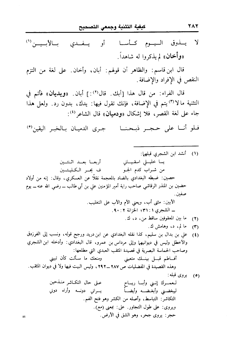 قال الفراء: من قال هذا [أبك. قال: ] أبان. "ويديان" فأتم في التثنية ما لا يتم في الإضافة، فإنك تقول فيها: يدك، بدون رد. ولعل هذا جاء على لغة القصر، فلا إشكال "ودميان" قال الشاعر: