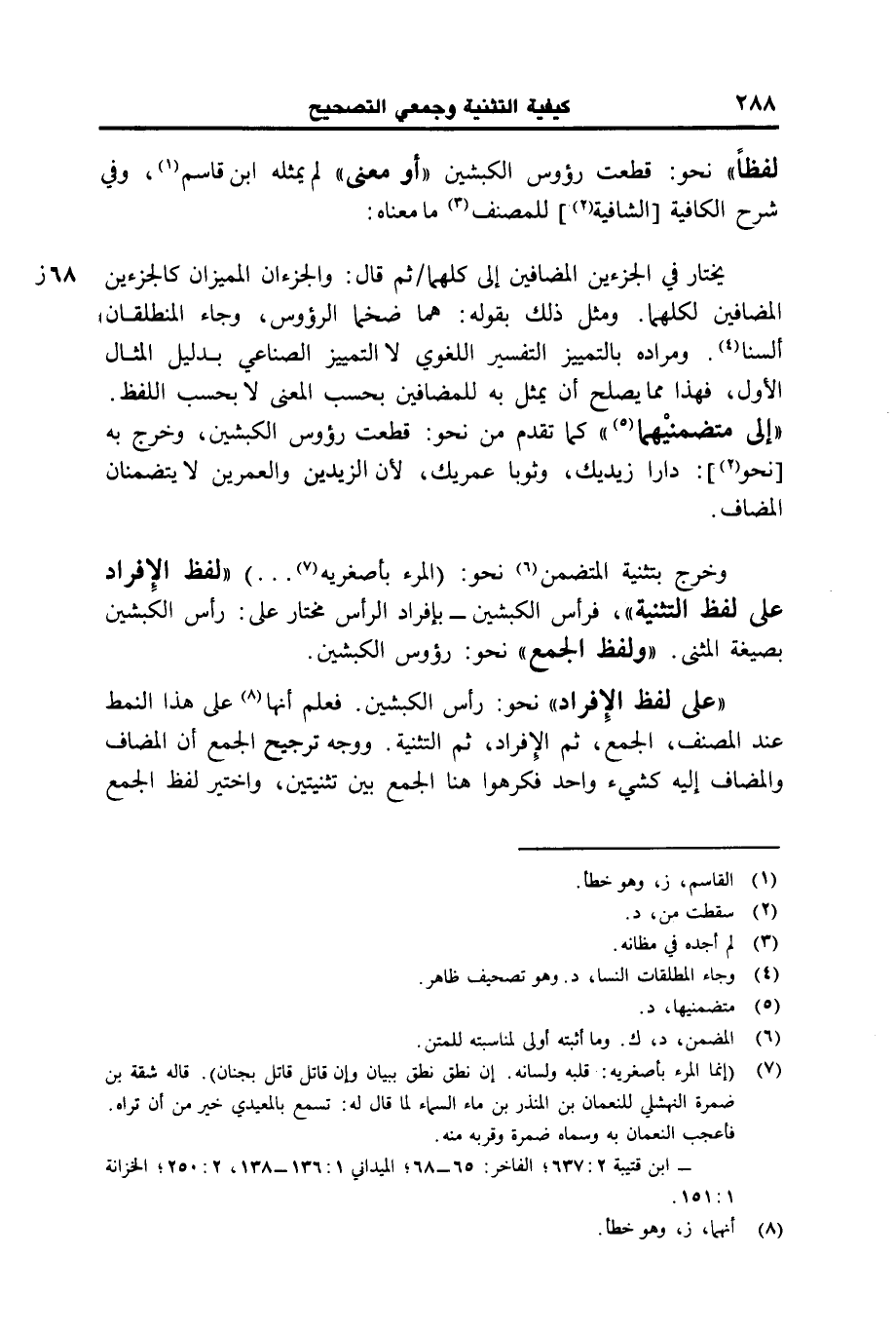 "على لفظ الإفراد؟ نحو: رأس الكبشين. فعلم أنها على هذا النمط عند المصنف، الجمع، ثم الإفراد، ثم التثنية. ووجه ترجيح الجمع أن المضاف والمضاف إليه كشيء واحد فكرهوا هنا الجمع بين تثنيتين، واختير لفظ الجمع