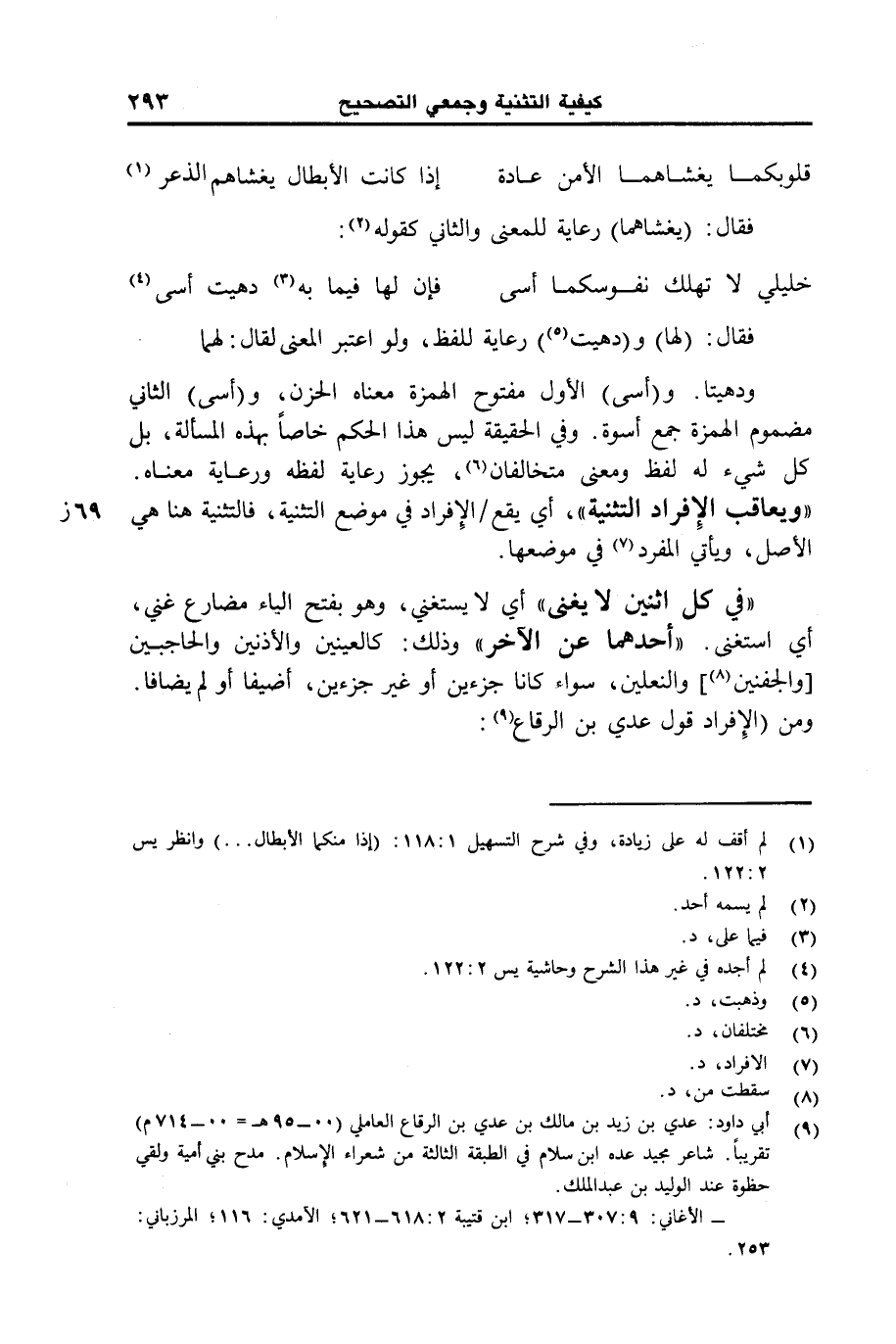 فقال: (لها) و (دهيت) رعاية للفظ، ولو اعتبر المعنى لقال: لهما ودهيتا. و (أسى) الأول مفتوح الهمزة معناه الحزن، و (أسى) الثاني مضموم الهمزة جمع أسوة. وفي الحقيقة ليس هذا الحكم خاصا بهذه المسألة، بل كل شيء له لفظ ومعنى متخالفان، يجوز رعاية لفظه ورعاية معناه. "ويعاقب الإفراد التثنية"، أي يقع /الإفراد في موضع التثنية، هنا هي الأصل، ويأتي المفرد في موضعها.