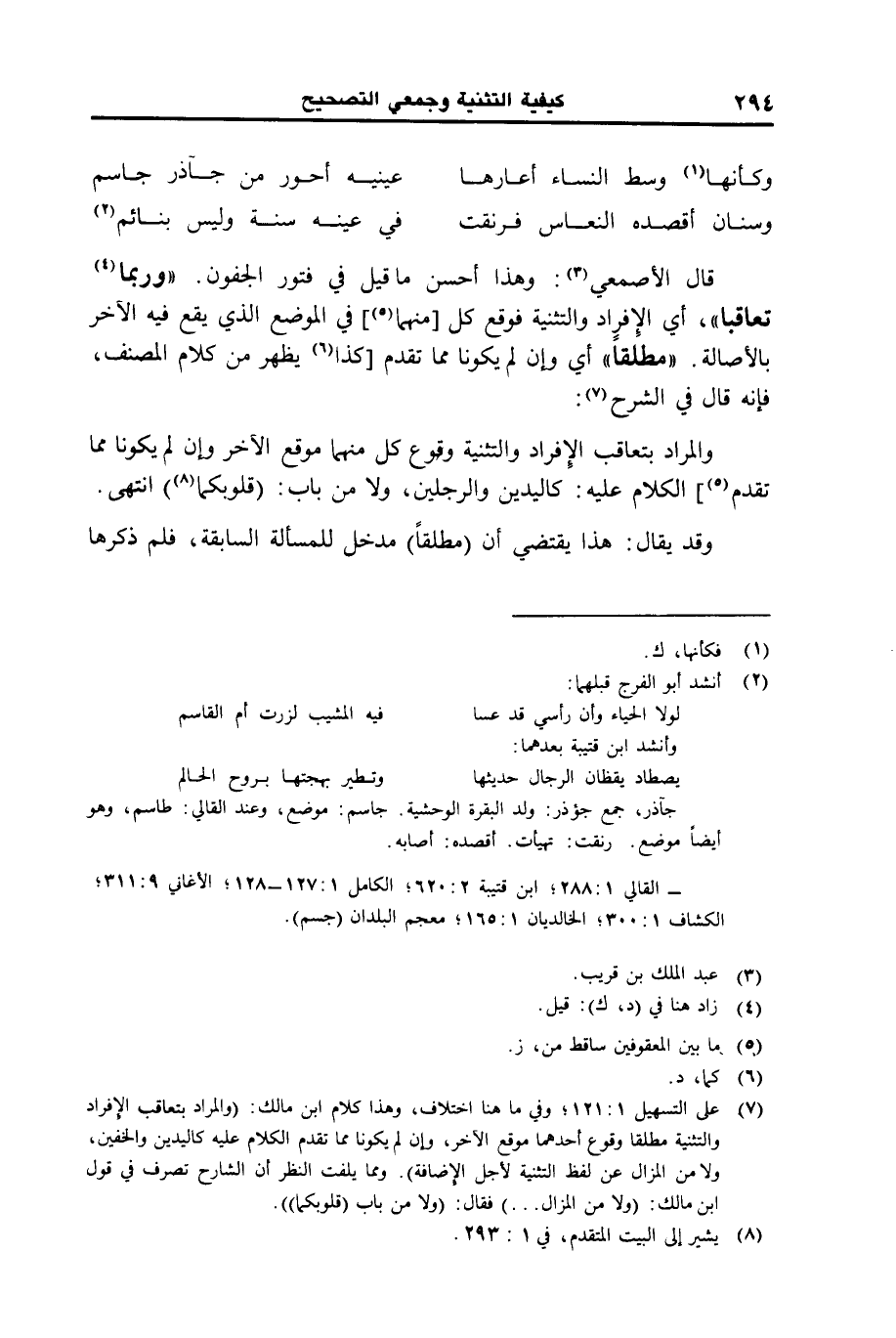 قال الأصمعي: وهذا أحسن ما قيل في فتور الجفون. "وربما تعاقبا"، أي الإفراد والتثنية فوقع كل [منهما] في الموضع الذي يقع فيه الآخر بالأصالة.